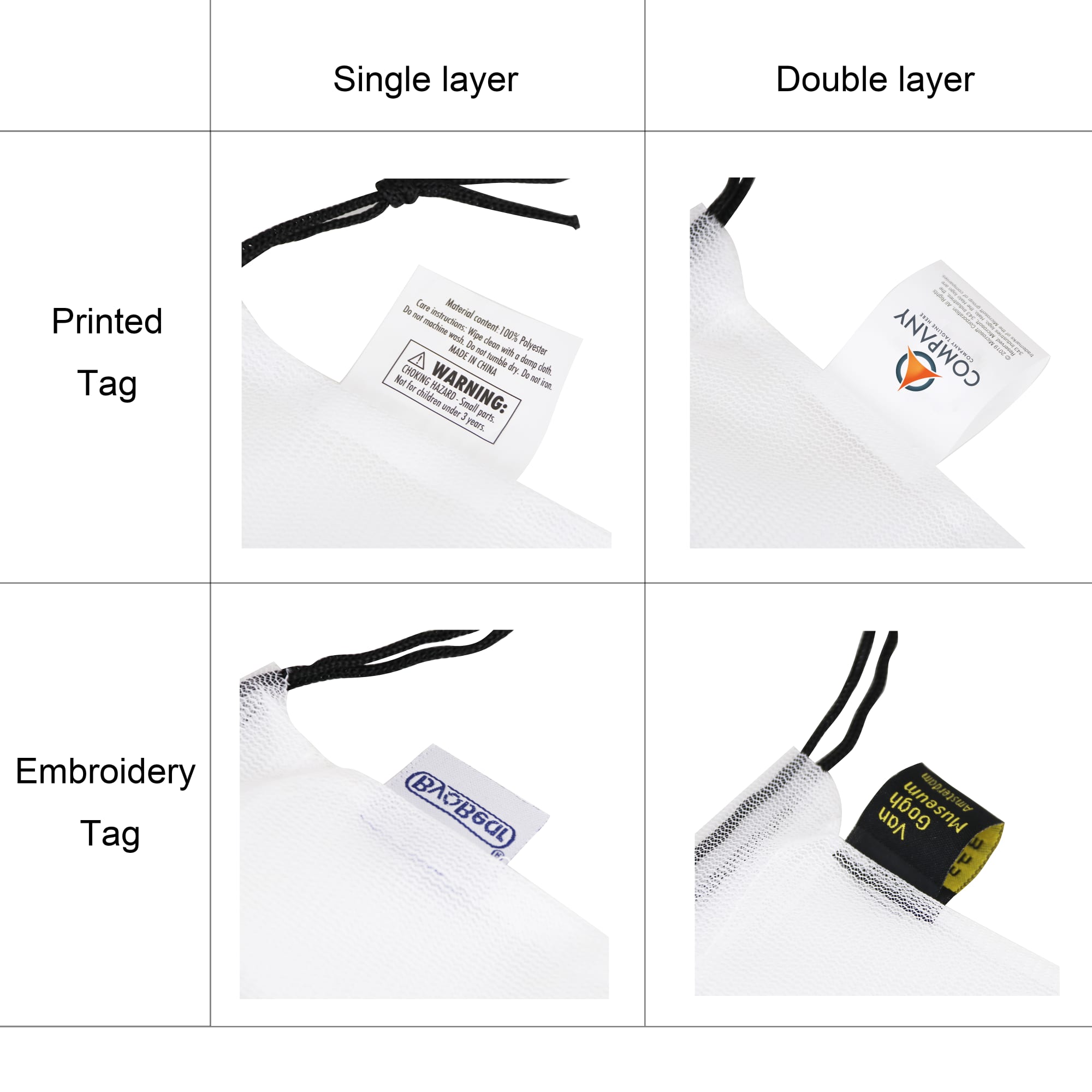 | Productsize | Mesh Bag: W 250mm x H 300mm Tag(single): 40 x 20mm Tag(double): 80 x 20mm Paper Roll Package: 190 x 70mm |