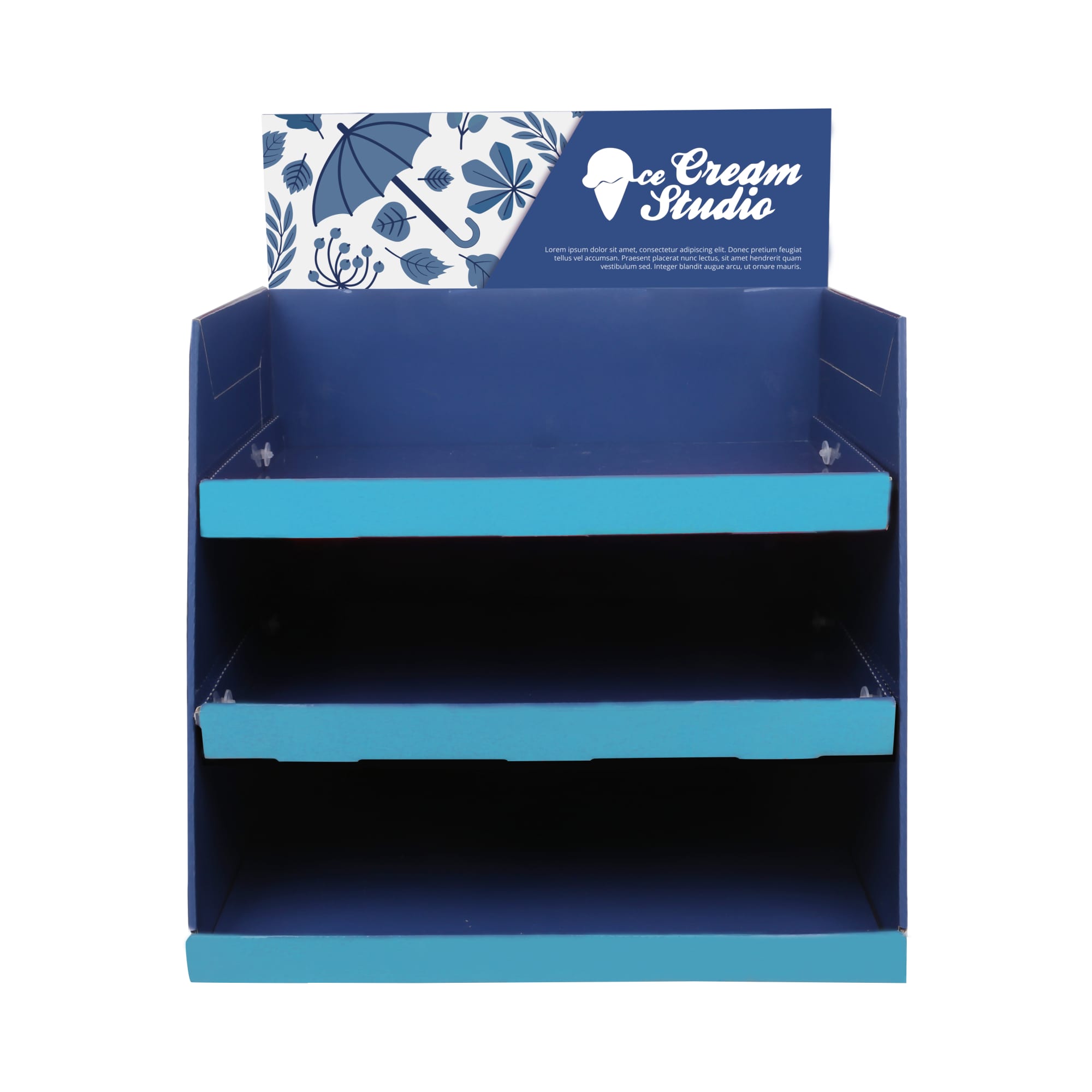 3 Tiers Counter Display is an ideal way to roll out your products in a cost-effective way. Our lightweight and environmentally friendly cardboard counter can be fully customized design to hold any products you want. Great printing area allows you to stand out your branding maximumly in the shows, exhibitions or supermarkets. In additions, this item is 100% made of recycled and wasted paper, ideal for environment protection. Glossy and matte lamination surface treatment is available to choose from.