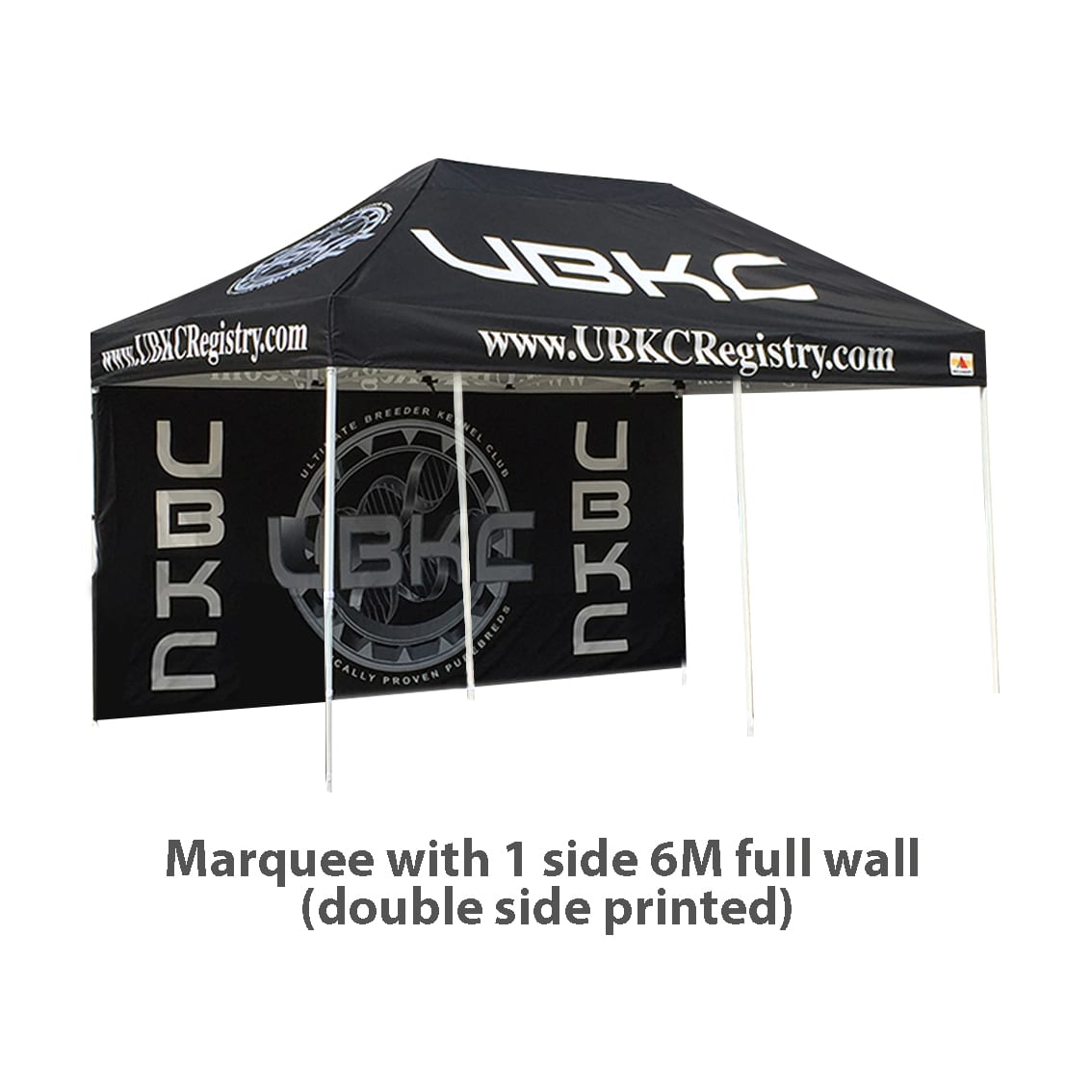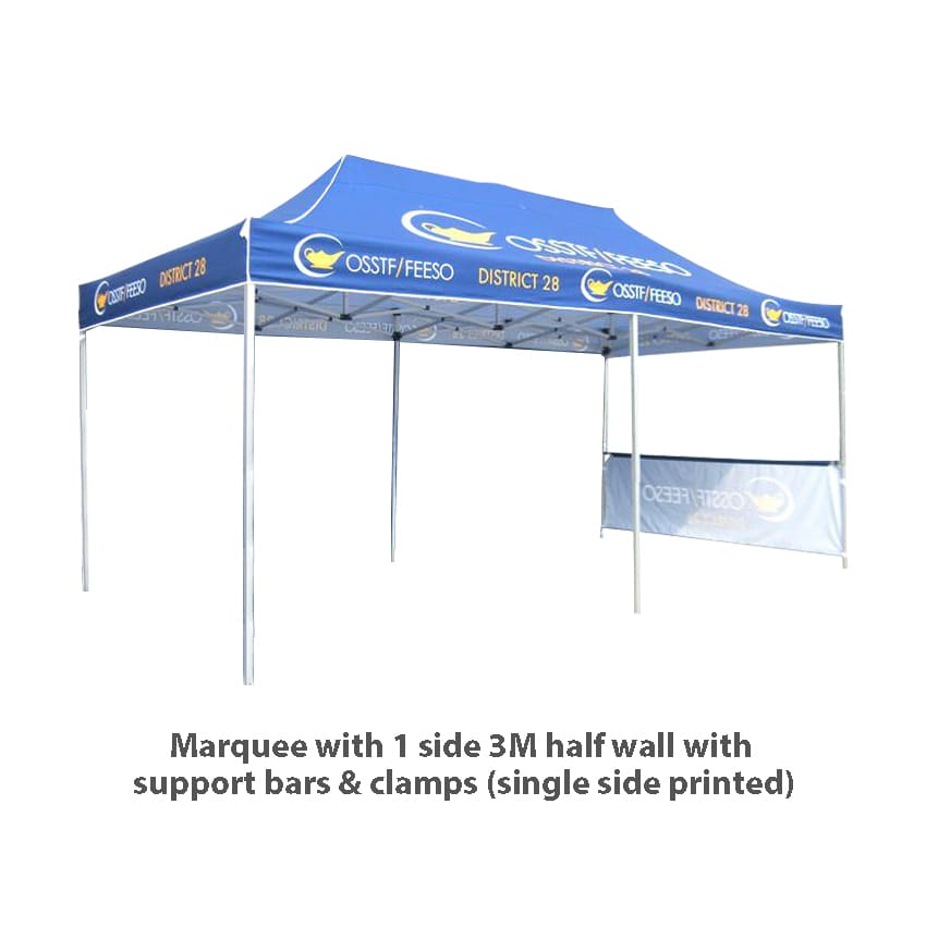 3m * 6m heavy duty Marquee with durable aluminum frame and industrial strength oxford PU material roof top. Standard package includes: Hexagon aluminum frame, commercial grade polyester canopy, roller carry bag, ropes and pegs. Optional extras include: half wall, full wall, half wall bar with clamps, tent banner mount kit and sand bag.