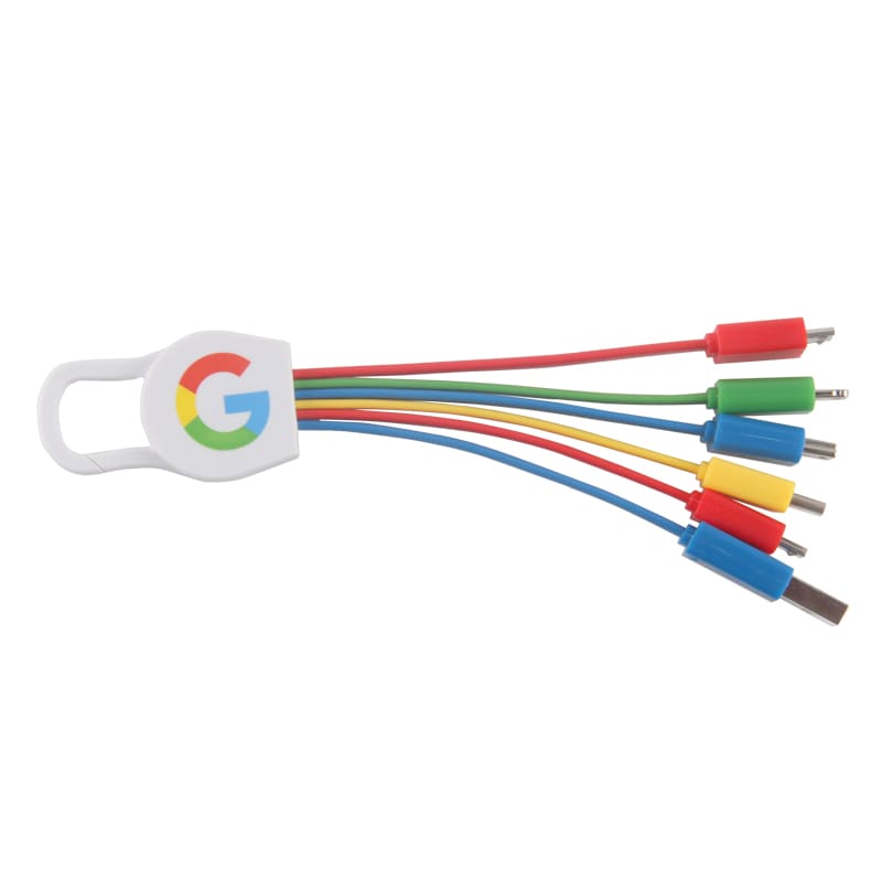 Never run out of cables again! Our 6 in 1 charger can just be thrown on your key chain for easy 24/7 access. Whether in the office or at home, is a great versatile product. Comes with a white base and an assortment of 13 colors that you can choose from.