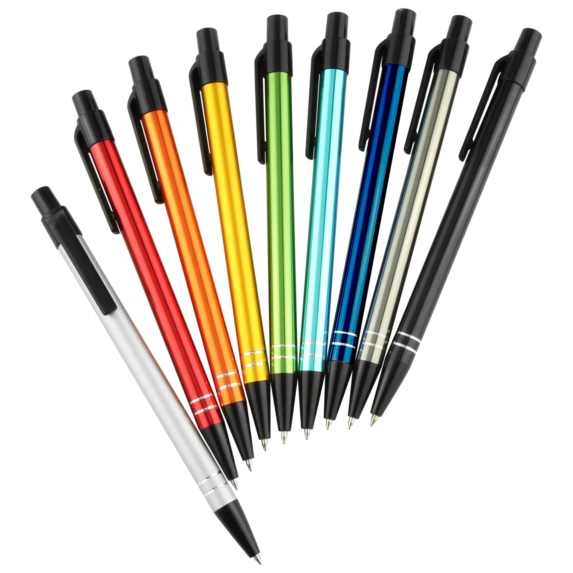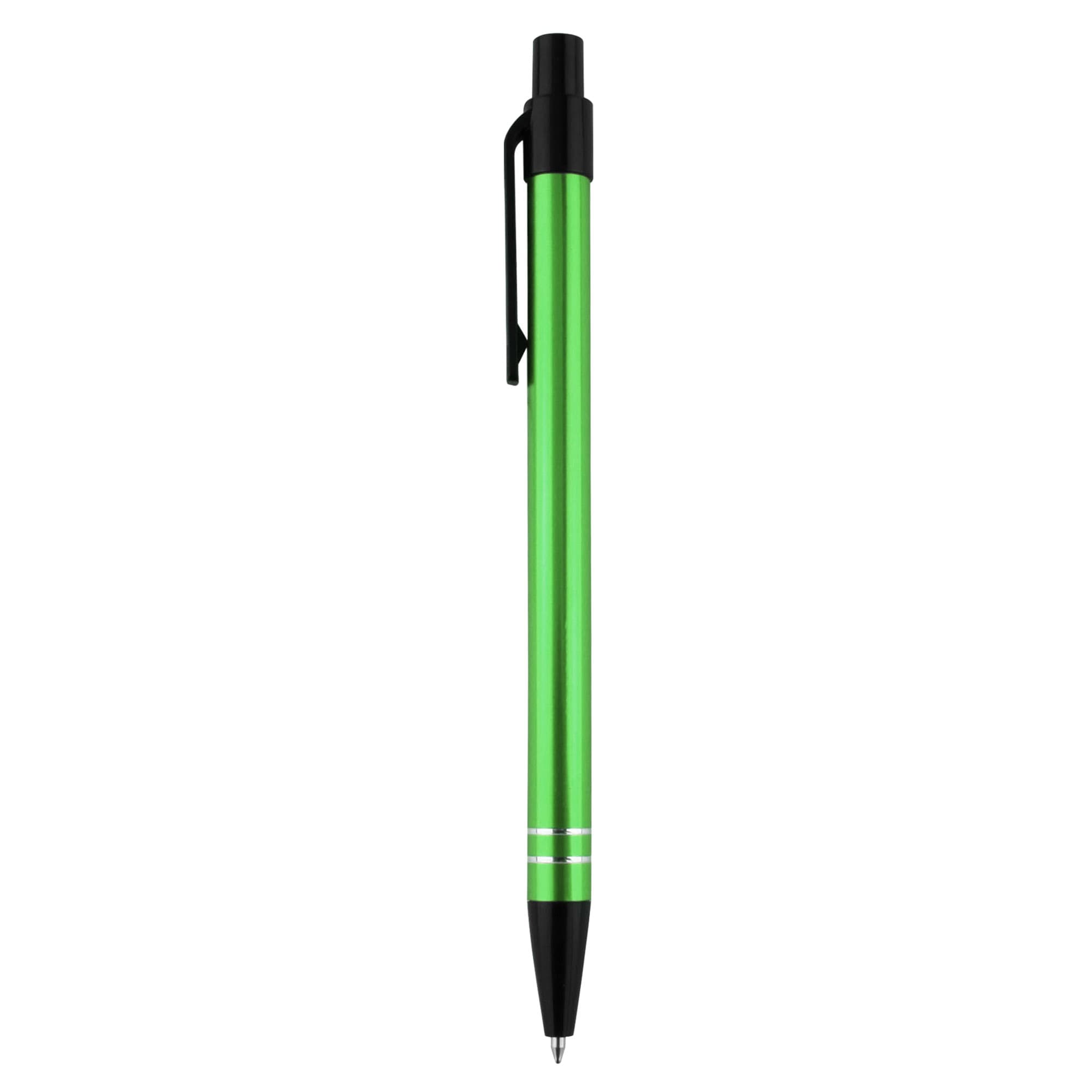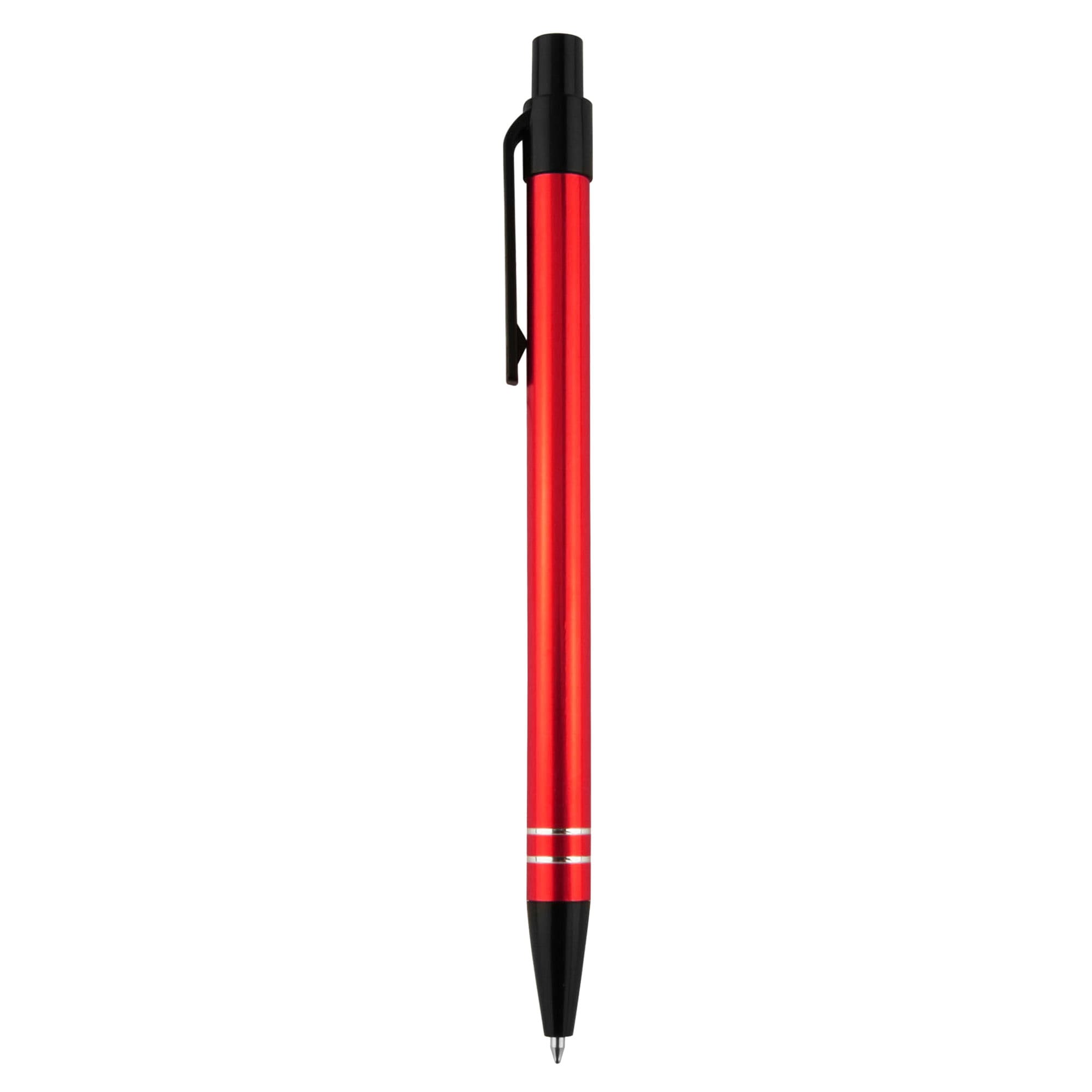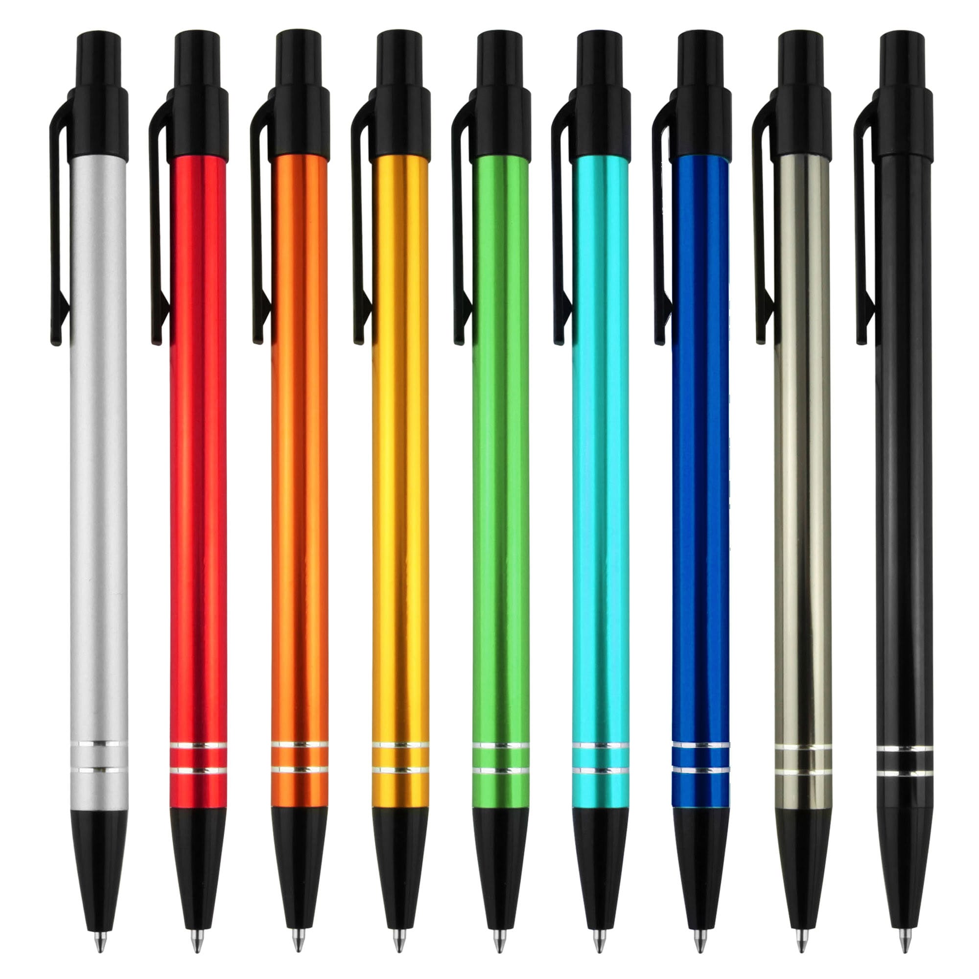 Great colour range for matching to corporate or team colour a slim profile barrel with easy retractable mechanism and 2 shiny silver rings at end of barrel. A simple stylish design aluminium metal pen finished in shiny rich metallic colours with contrasting black plastic trims. Plastic cross-type German manufactured black ink refill 1200 meters writing distance tungsten carbide ball provides you with quality writing. These writing tools are sure to get some attention.