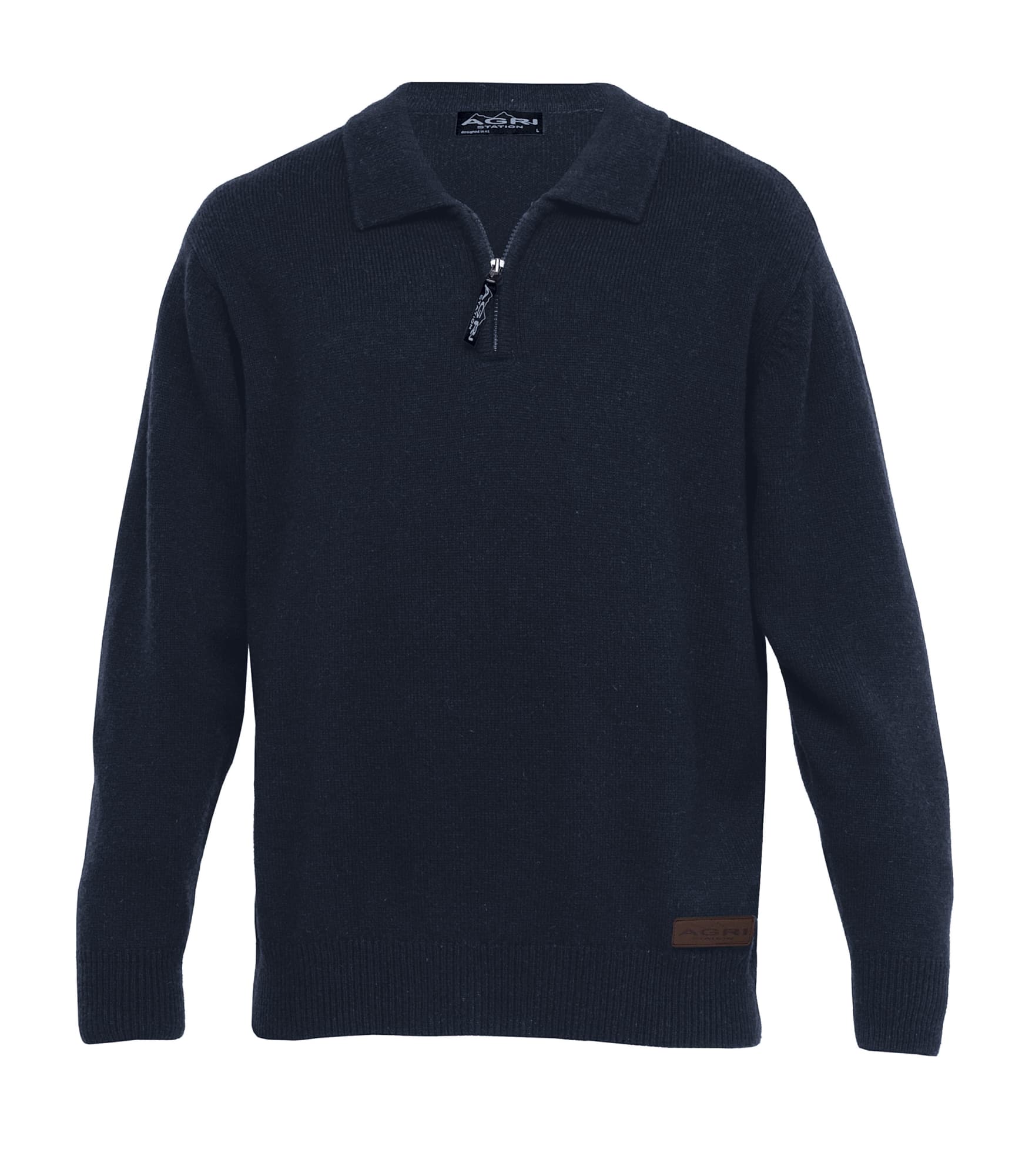 100% shetland wool|Fully fashioned|Classic fit|Flat knit collar|Vislon zip jet plaquet with AGRI STATION puller|1×1 rib hem and cuff|AGRI STATION embossed suede badge