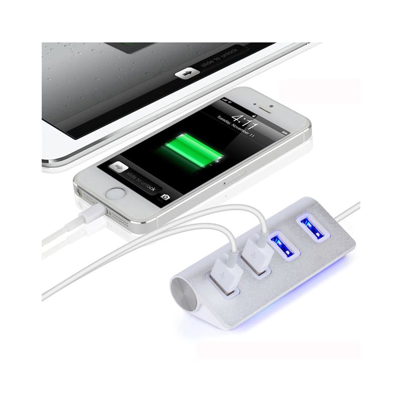 Lightweight and sleek in design this aluminium light hub provides 4 x USB 2.0 ports and a 30 cm cable with either USB or Type-C connectors. Longer cable lengths are optional extras. Material: Aluminium.