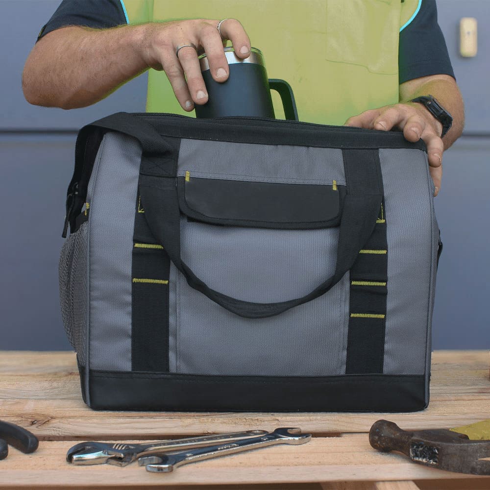 Heavy duty materials make the Workman’s crib cooler ideal for the toughest job. Zippered main compartment holds up to 24 cans. Unique hard hinge opening reminiscent of a tool bag, blue/grey colour.
