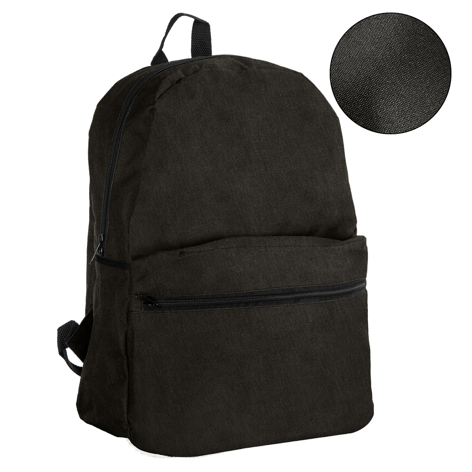 This quality backpack is manufactured from Cationic Dyed Polyester (also called polyester linen type filament) which is softer and more comfortable fabric better than normal polyester and features anti-static electricity. It has wide padded adjustable straps and padded back feels more comfortable when you carry the bag other features includes the large zipped front pouch and two side pockets for drinking bottles. Max volume capacity is 17-18 litres.