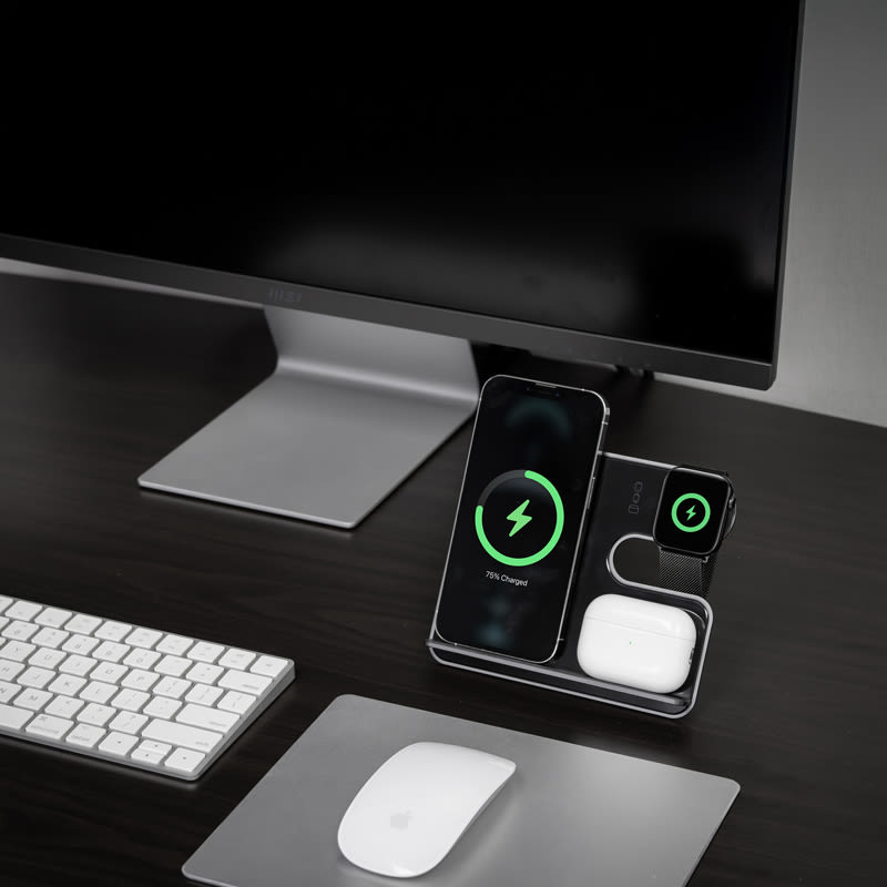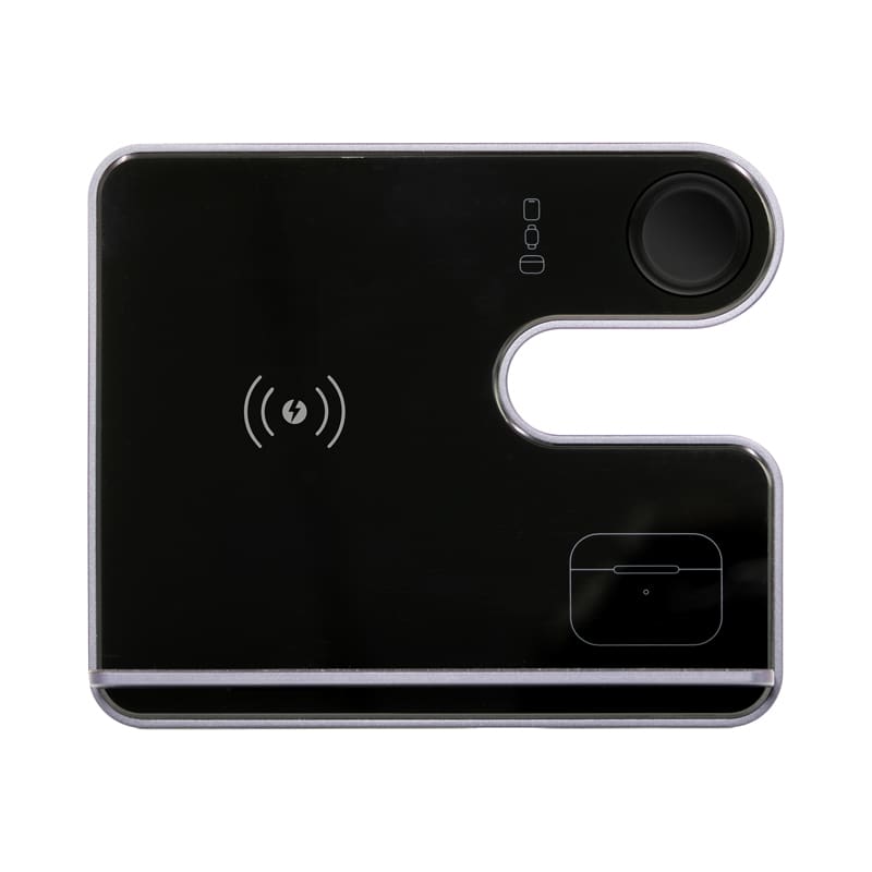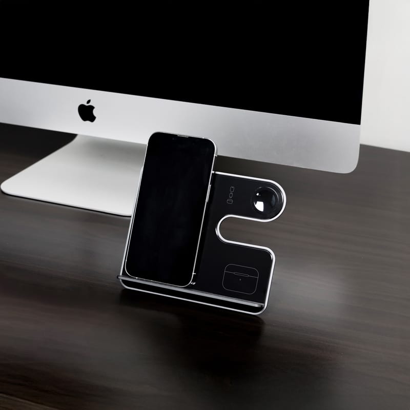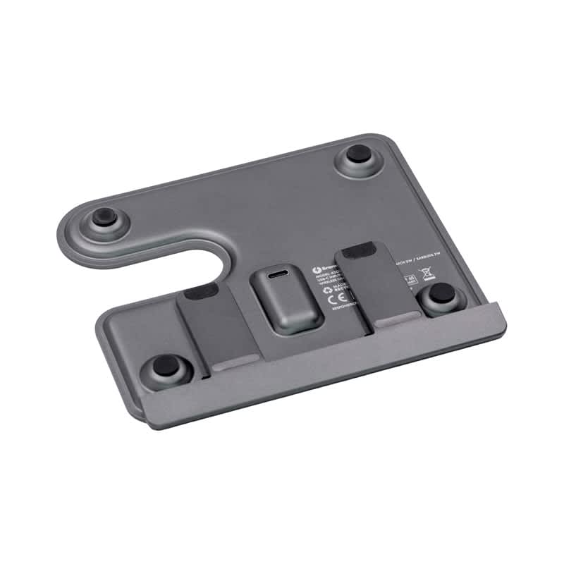 The Ascend Charge Eco Pro is the ultimate sustainable and versatile 3-in-1 wireless charging station and stand. Crafted from recycled aluminium, this innovative device allows you to charge your phone, earbuds, and Apple Watch wirelessly all at once, seamlessly combining convenience and eco-conscious design. The Eco Pro is a sleek, modern desk accessory that organises your gadgets while enhancing your workspace’s aesthetic. Its clever design features a removable L-shaped stand that quickly detaches and magnetically reattaches, making it perfect for flat transportation and on-the-go use. Compact and portable, the Eco Pro includes a Type-C to Type-C charging cable and a user manual. Its lightweight design effortlessly fits into any bag, so you can stay powered up no matter where life takes you. Material: Recycled Aluminium.