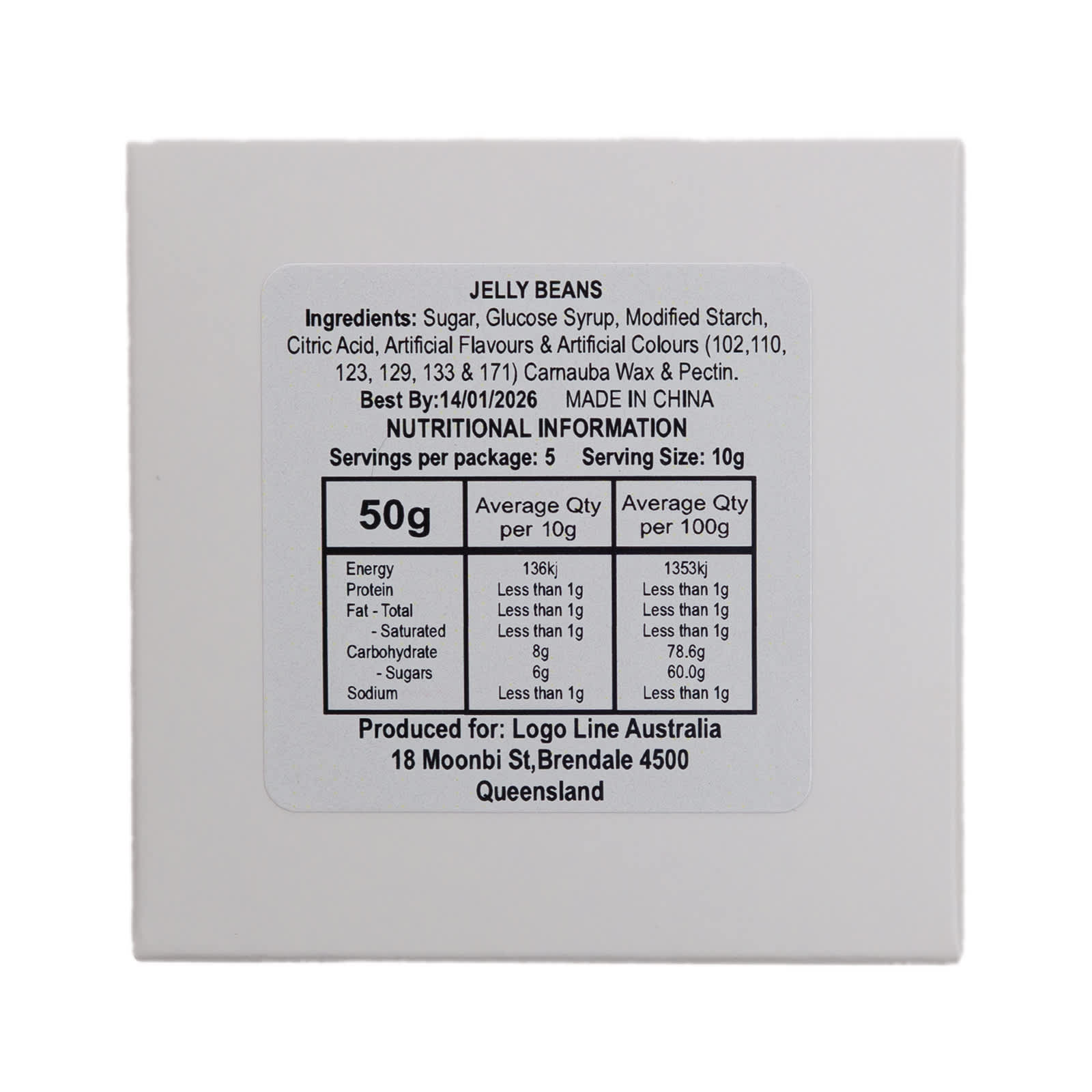 Enjoy 50 grams of gluten-free Assorted Colour Mini Jelly Beans, neatly packed in a white tuck box. Each box includes a fun mix of nine great colours and flavours — White (Lychee), Yellow (Lemon), Orange (Orange), Red (Strawberry), Purple (Grape), Pink (Raspberry), Green (Apple), Blue (Blueberry), and Black (Aniseed). Perfect for promotional giveaways, these colourful treats are a sweet way to share your brand.