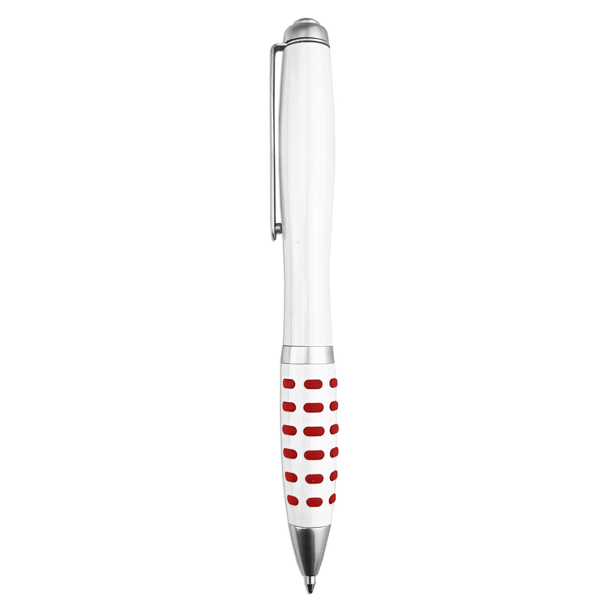 A quality heavy copper metal pen white barrel with silver trim and coloured soft-touch dotty grip. Click action with metal Parker-Type German manufactured black ink refill 1500 meters writing distance tungsten carbide ball provides you with quality writing. Copper barrel with chrome coated(engrave silver colour).