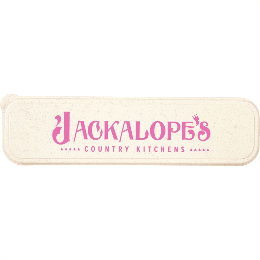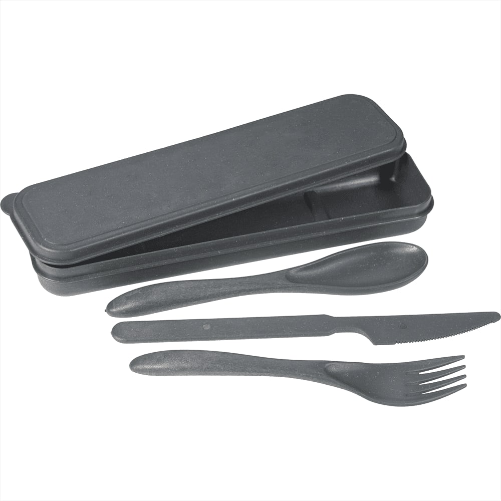 This 3 piece set includes fork, spoon and knife in a convenient carrying case. The set is perfect for being on the go and eliminating the use of disposable plastic utensils! Items is composed of 51% bamboo fiber and 49% plastic