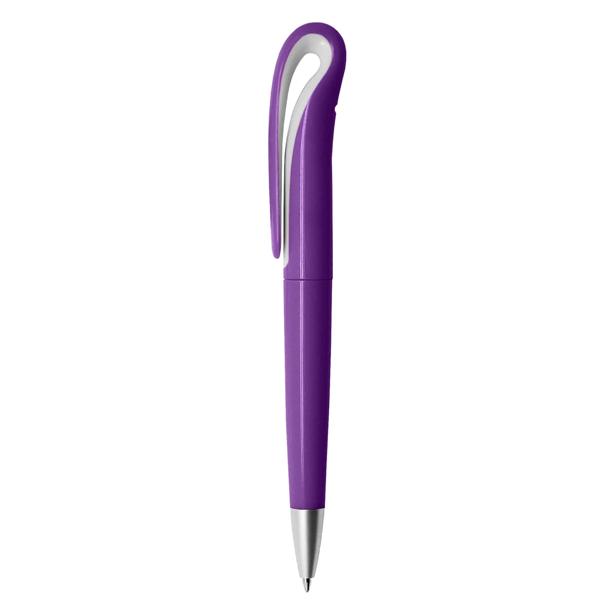 Twist action European style plastic pen coloured barrel with shiny silver chrome tip an eye catching stylish unique design clip a great promotional pen for your corporate logo or next event. It has high quality German manufactured black ink refill 1800 meters writing distance tungsten carbide ball provides you with quality writing.