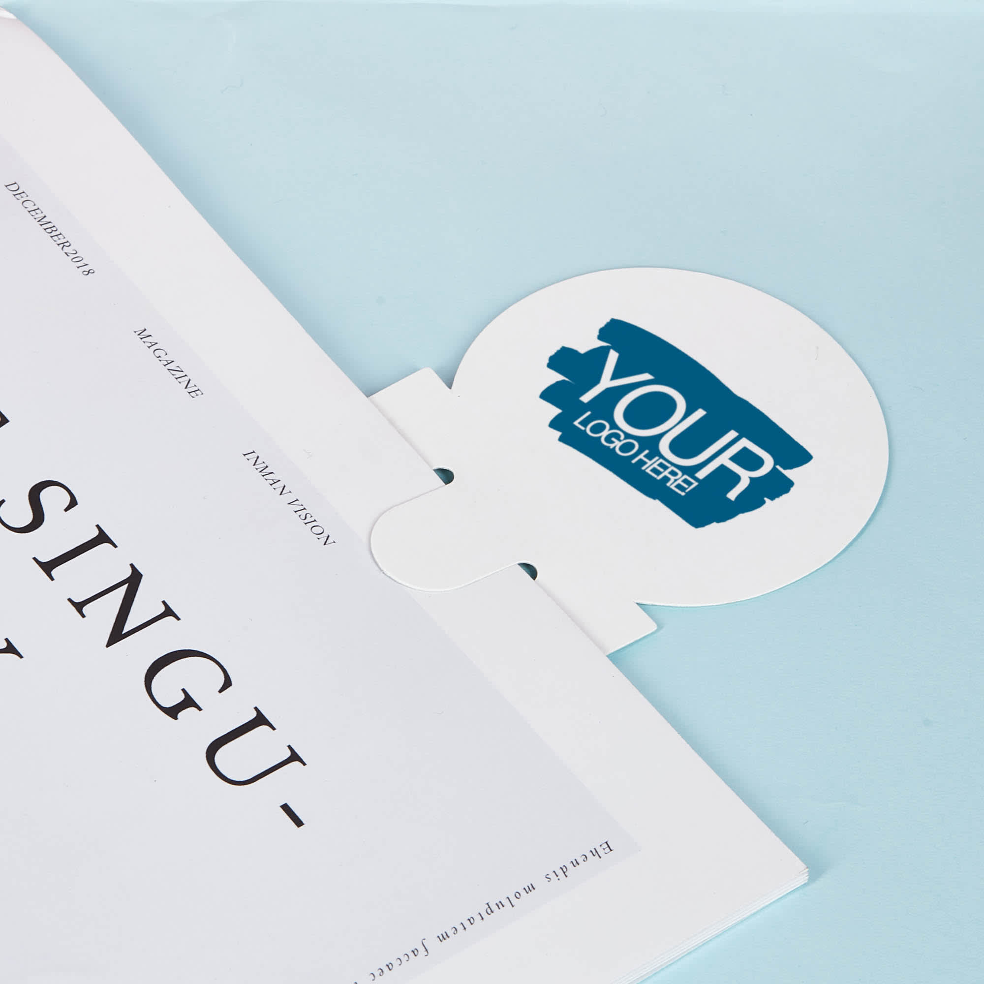 A cardboard bookmark ruler with a round printing area. A block of 25 leaves adhesive note pad (40 mm x 28 mm) and 5 block of 25 leaves of adhesive paper note flags (Blue Green Yellow Pink Orange).