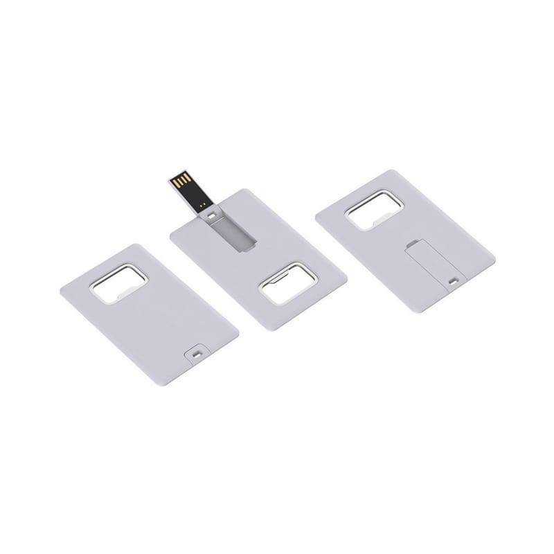 Credit card style flash drive complete with built-in steel bottle opener, Grade A memory, ten-year data retention warranty, two-year replacement warranty on faulty manufacture. Material: ABS, Steel.