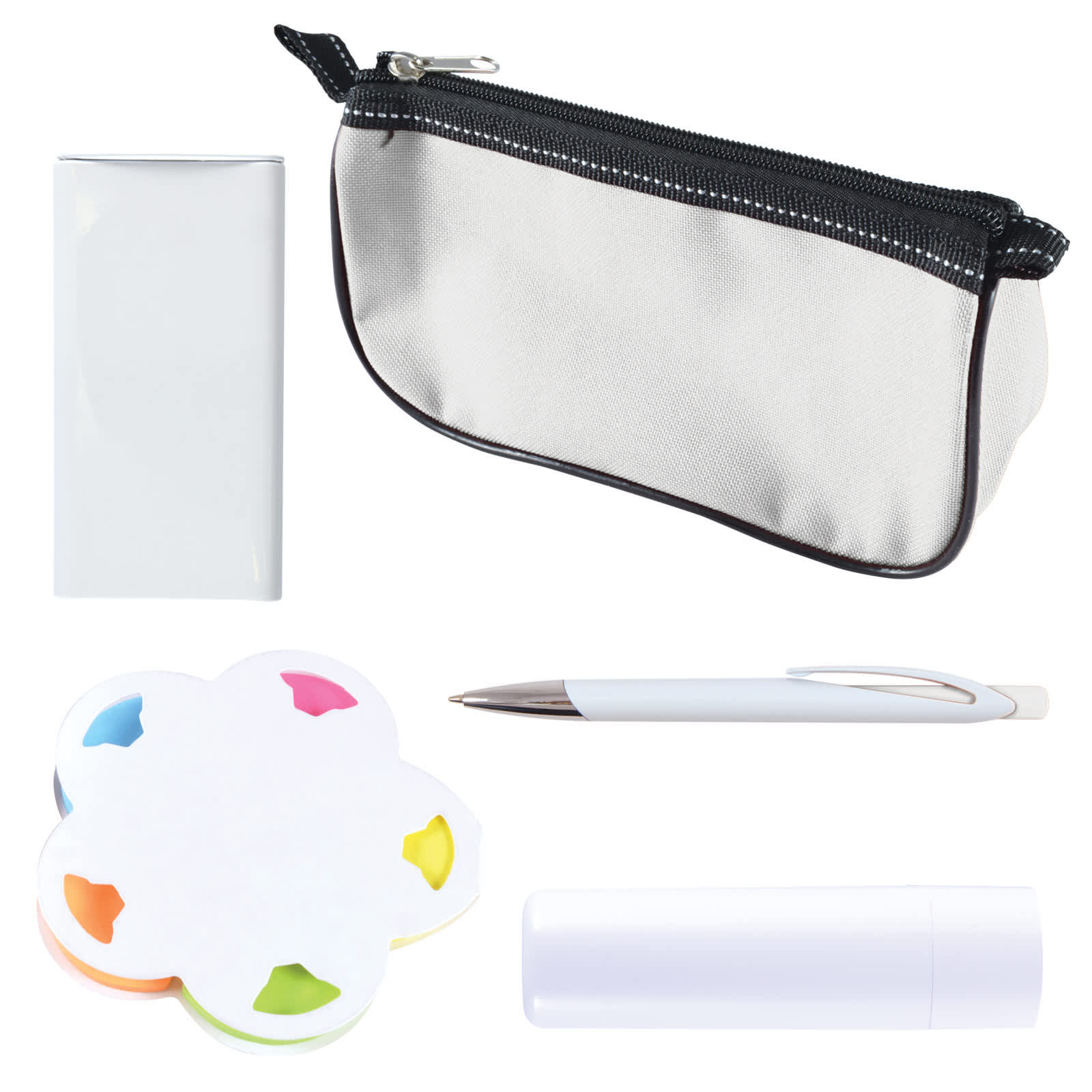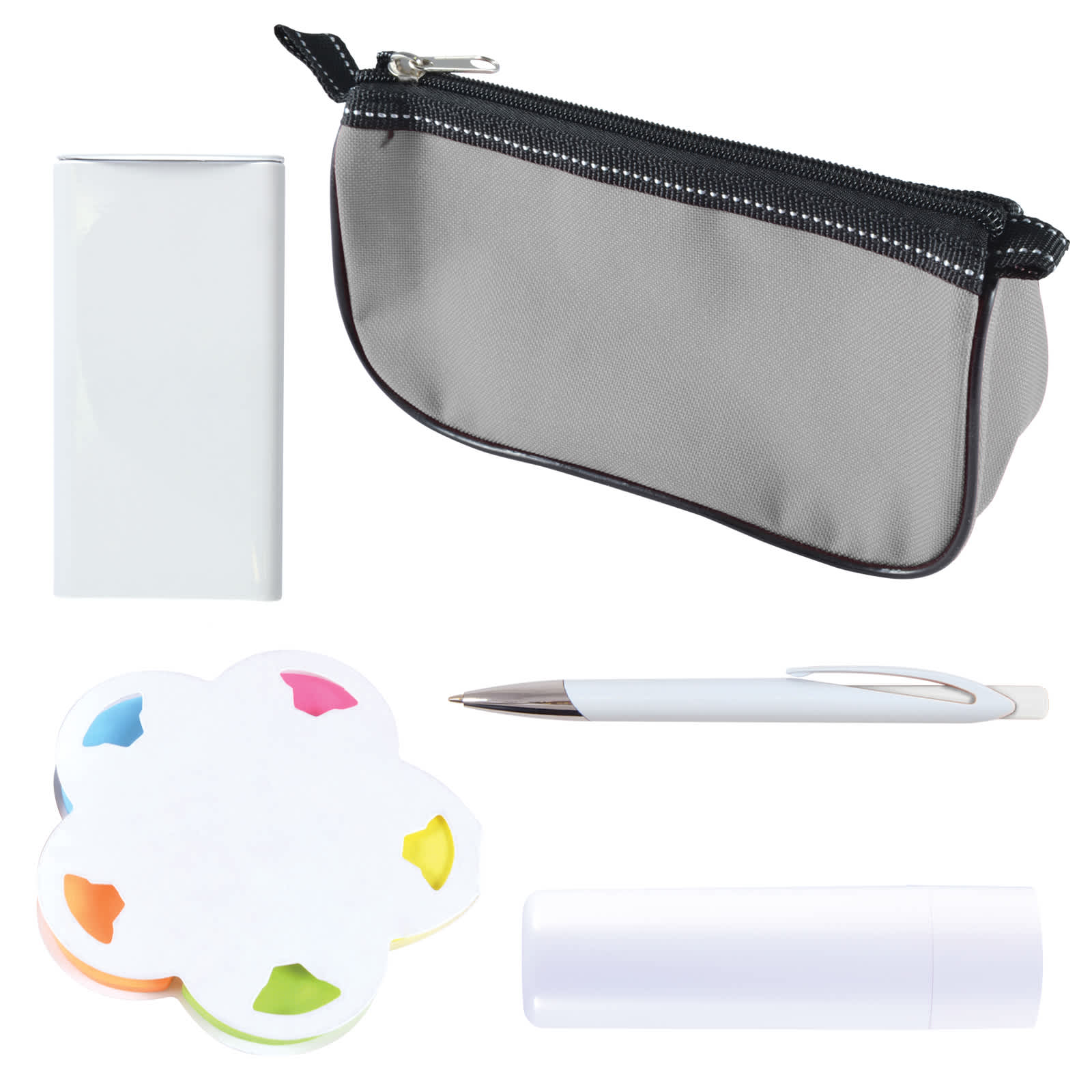 | Materials | Lip balm: PP Tube; Pencil case: polyester; Mints: spearmint; Pen: PP; Sticky Notes: paper. |