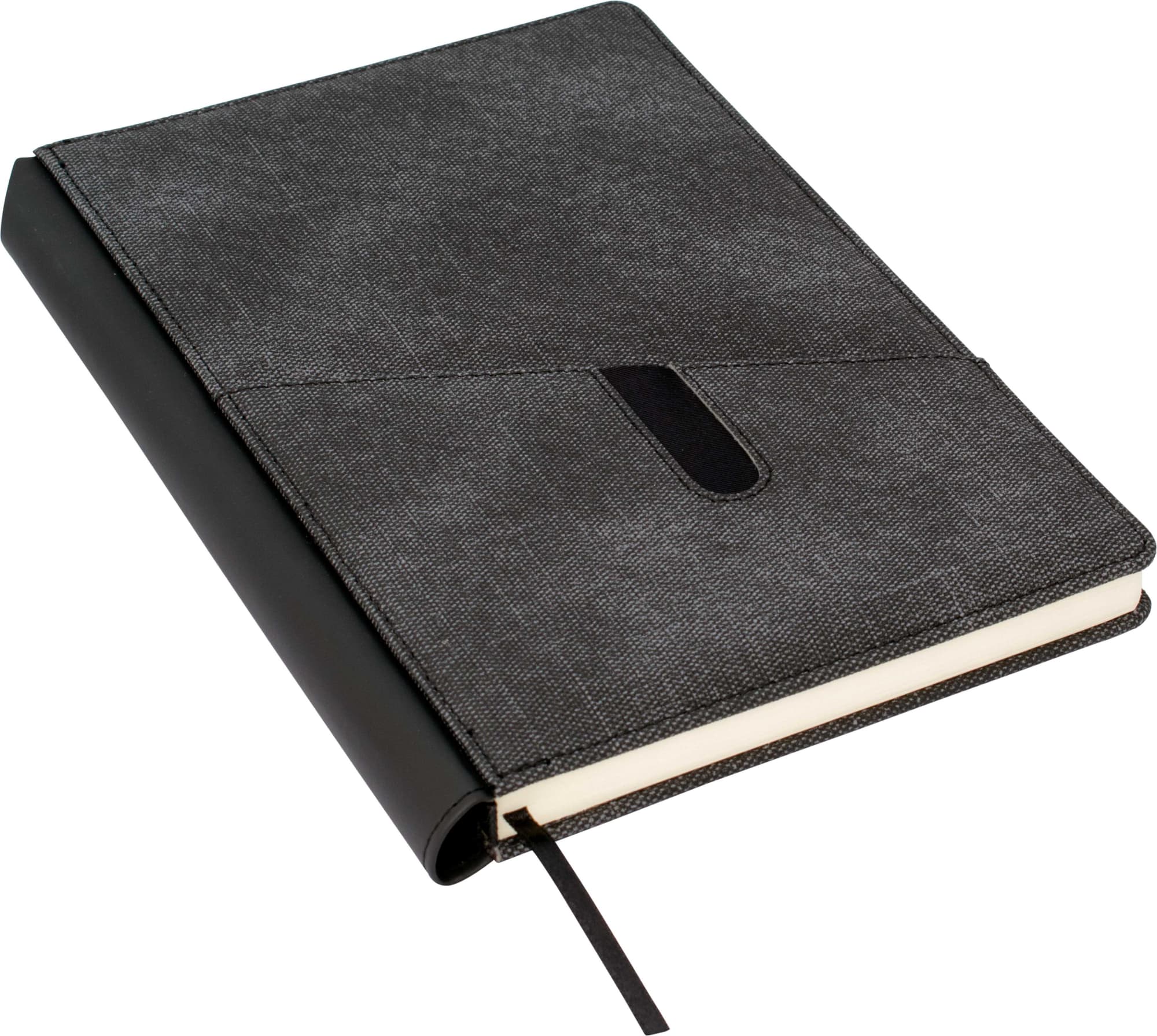 The on trend casual appearance of this A5 notebook is achieved with the use of a faded denim leatherette finish. Featuring an angled front pocket ideal for holding a mobile phone or business cards as well as a rubber feel pen sleeve (pen additional), Calgary will certainly make an impression. Available in mottled black with black spine.