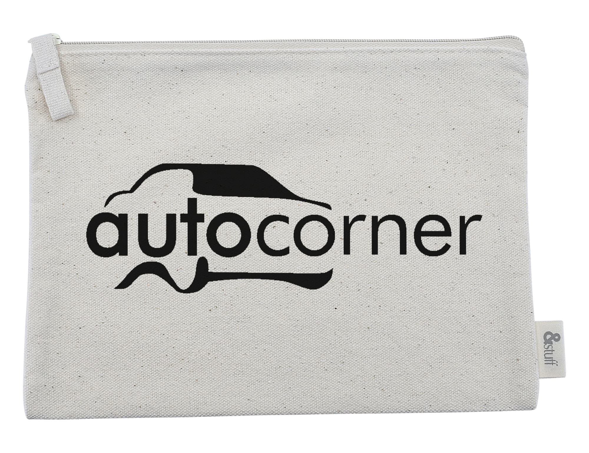 Options – select either: (1) natural or black coloured zip, (2) natural cotton zip puller or leatherette zip puller, (3) cotton handle, (4) debossed logo onto the leatherette badge or screen printed directly onto the calico material (additional charges apply for some of these options – see below).