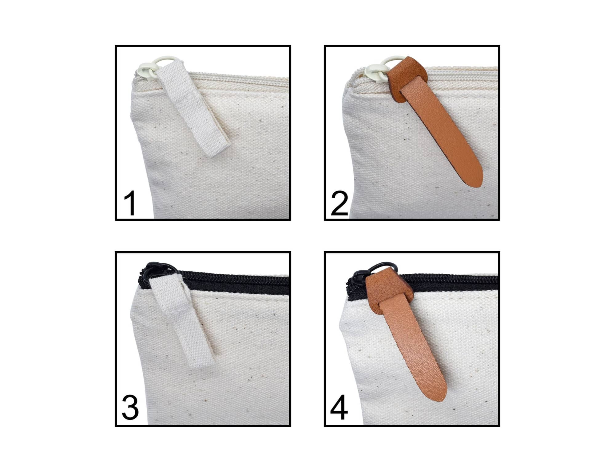 Options – select either: (1) natural or black coloured zip, (2) natural cotton zip puller or leatherette zip puller, (3) debossed logo onto the leatherette badge or screen printed directly onto the calico material (additional charges apply for some of these options – see below).