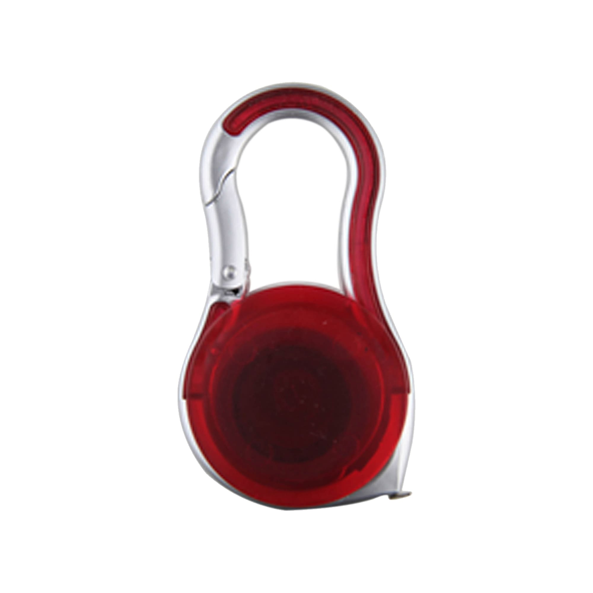 Plastic carabiner key tag tape measure with bendable 2 meters long metal ruler tape silver trim with coloured semi transparent on sides carabiner hooks it onto your key chain.