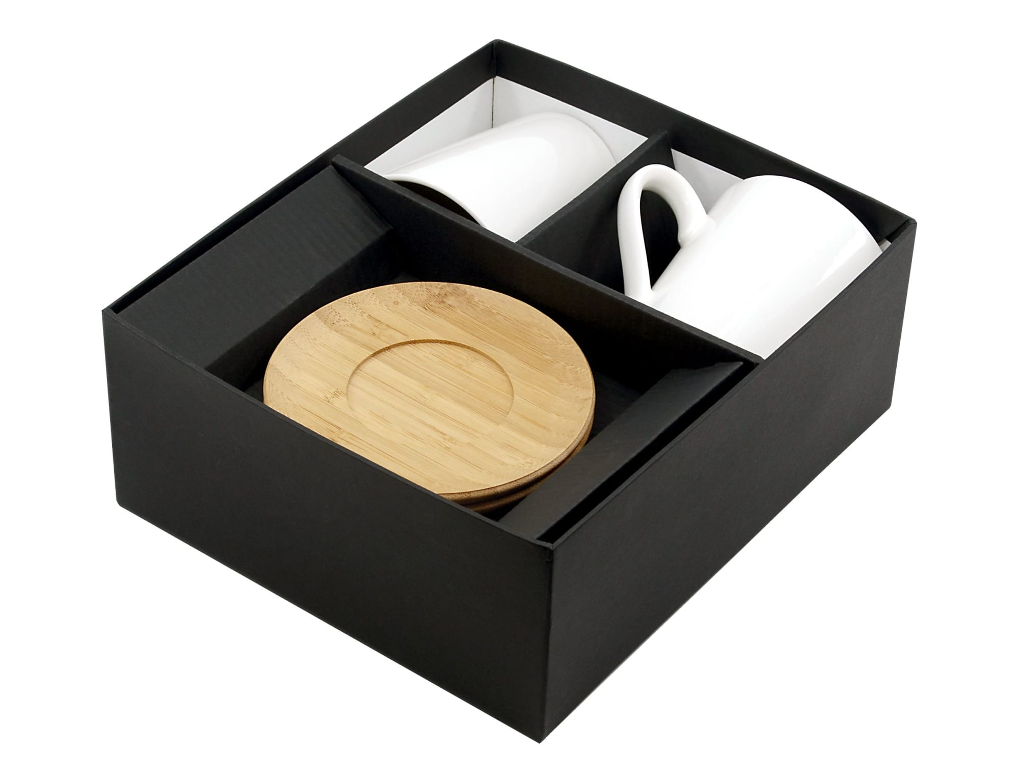 This gift-set contains 2 Carmel Vee mugs and saucers and is supplied packed in a sturdy gift box with cleat lid. The classic ‘V’ shape of this quality ceramic mug, combined with the natural look of the bamboo saucer makes this a truly unique gift. The saucer, featuring your logo, is crafted from environmentally friendly bamboo and adds to the overall look and feel of this product. Because of the unique nature of bamboo, the product and engraving colour may vary from item to item. As this product is hand crafted, the saucer may differ slightly in shape and size across the order.