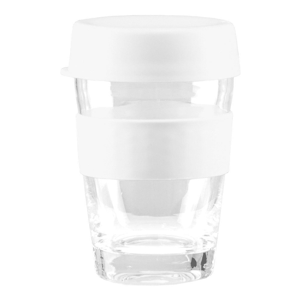 340ml glass coffee cup with push down PE lids and silicone bands available in a range of colours. Available in 6 colours or mix-and-match lids and sleeves in up to 36 combinations.