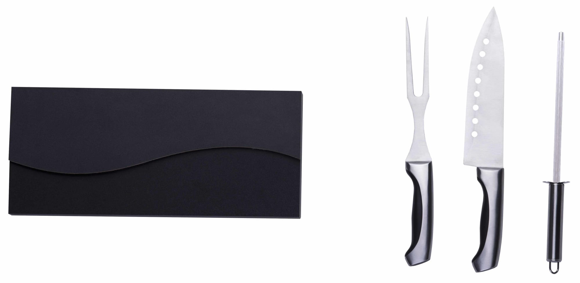 3-pcs Stainless steel carving set includes: 8″chefs knife, 7″ fork and 8″ sharpener|Moulded bespoke black MDF box|Supplied: in a black gift box