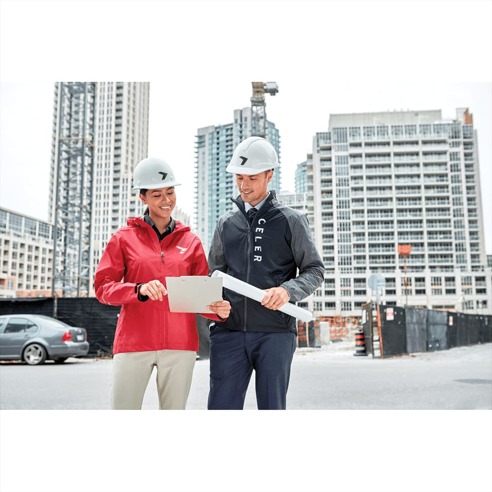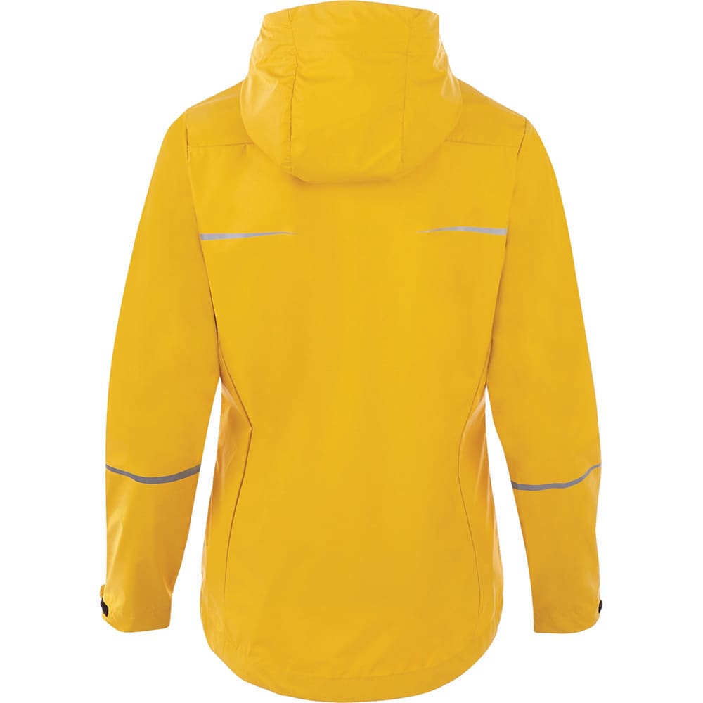 | Features | Centre front exposed waterproof zipper, interior zipper flap, hood with elastic drawcord and exterior cord locks, adjustable cuff tabs with hook and loop closure, dropped back hem, easy grip zipper pulls, heat transfer main label for tag less comfort, heat transfer reflective graphic detail, fully seam sealed, shaped seams and tapered waist for flattering fit, hanger loop at inside back neck. |