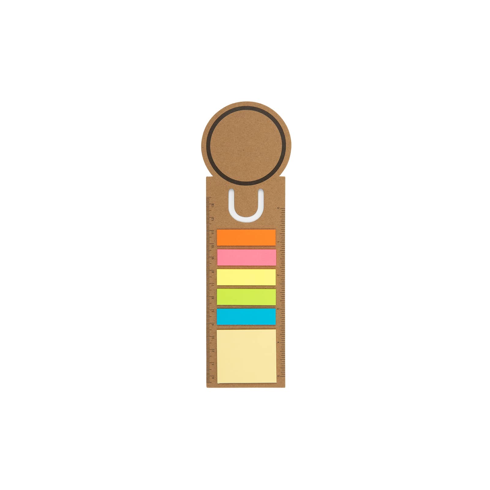 Enhance your reading and note-taking with our Circle Bookmark/Note flag Ruler. This multifunctional tool combines a 13cm/5 inch cardboard bookmark ruler with repositionable notepads and adhesive note flags. Perfect for students, professionals, and avid readers, it features one block of repositionable notepads with 15 leaves and five blocks of assorted adhesive note flags with 15 leaves per colour. Made from durable paper, this versatile accessory helps you keep track of your place in books and documents while jotting down important notes and reminders.