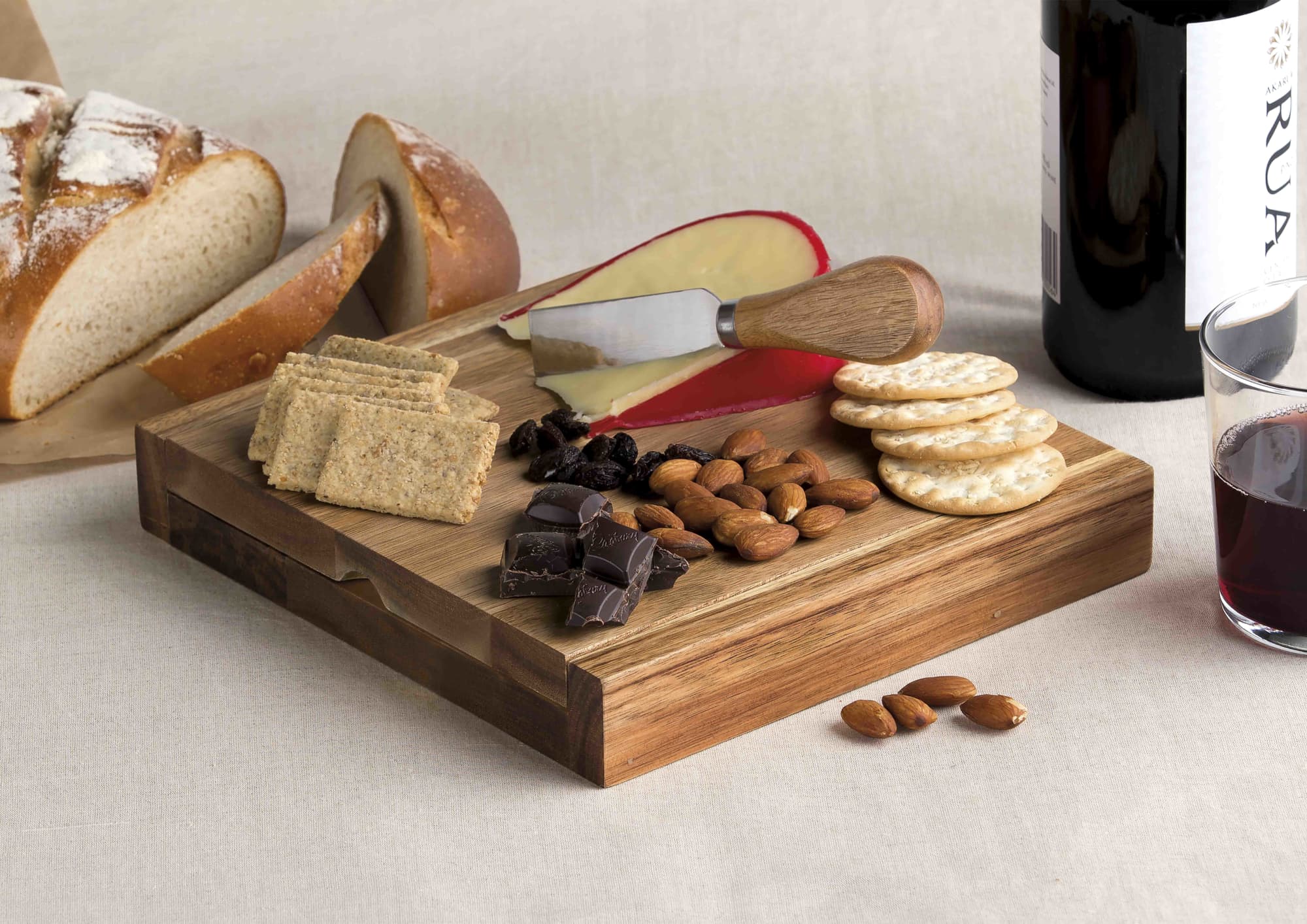 Plantation grown Acacia hardwood with FDA grade food oil finish|Stainless steel / Acacia hardwood utensils|Clamshell opening cheese board containing 3 x cheese knives & 1 x cheese fork|Each board displays its own character through its unique wood grain and subtle patina finish|Supplied: in a black po ‘di fame two part presentation box (24.5cm W x 4.5cm H x 23cm D)