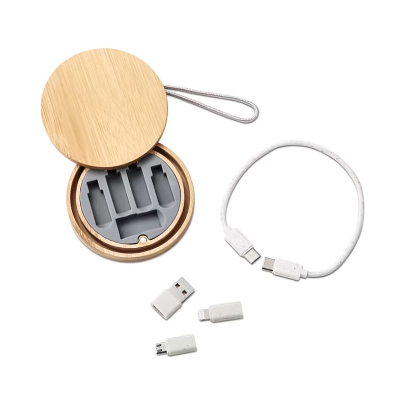 The Coburg Eco 3n1 cable set can be used with most smartphones or tablets, providing charging and data transfer options. With a Type-C cable and a comprehensive set of adaptors (Type-C to Lightning, Type-C to Micro and Type-C to Type-A adaptors), the Coburg is neatly packed in a compact, silicone-lined bamboo travel case. Suitable for use with all portable devices, including smartphones and tablets. Material: Bamboo, Wheat straw, Silicone.