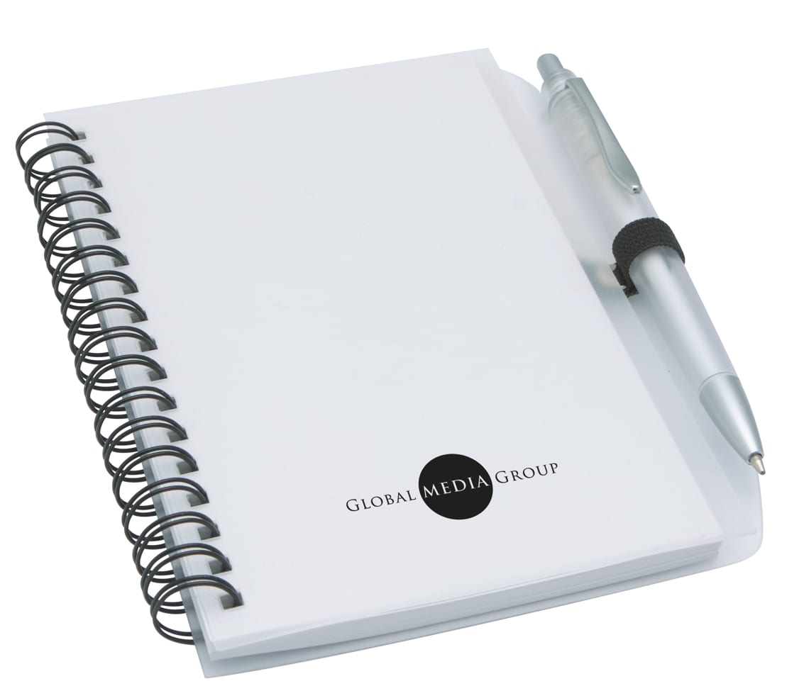 This funky spiral notepad and matching pen is great for use at conferences and meetings. Featuring a handy pen holder and available in translucent blue, red and clear.