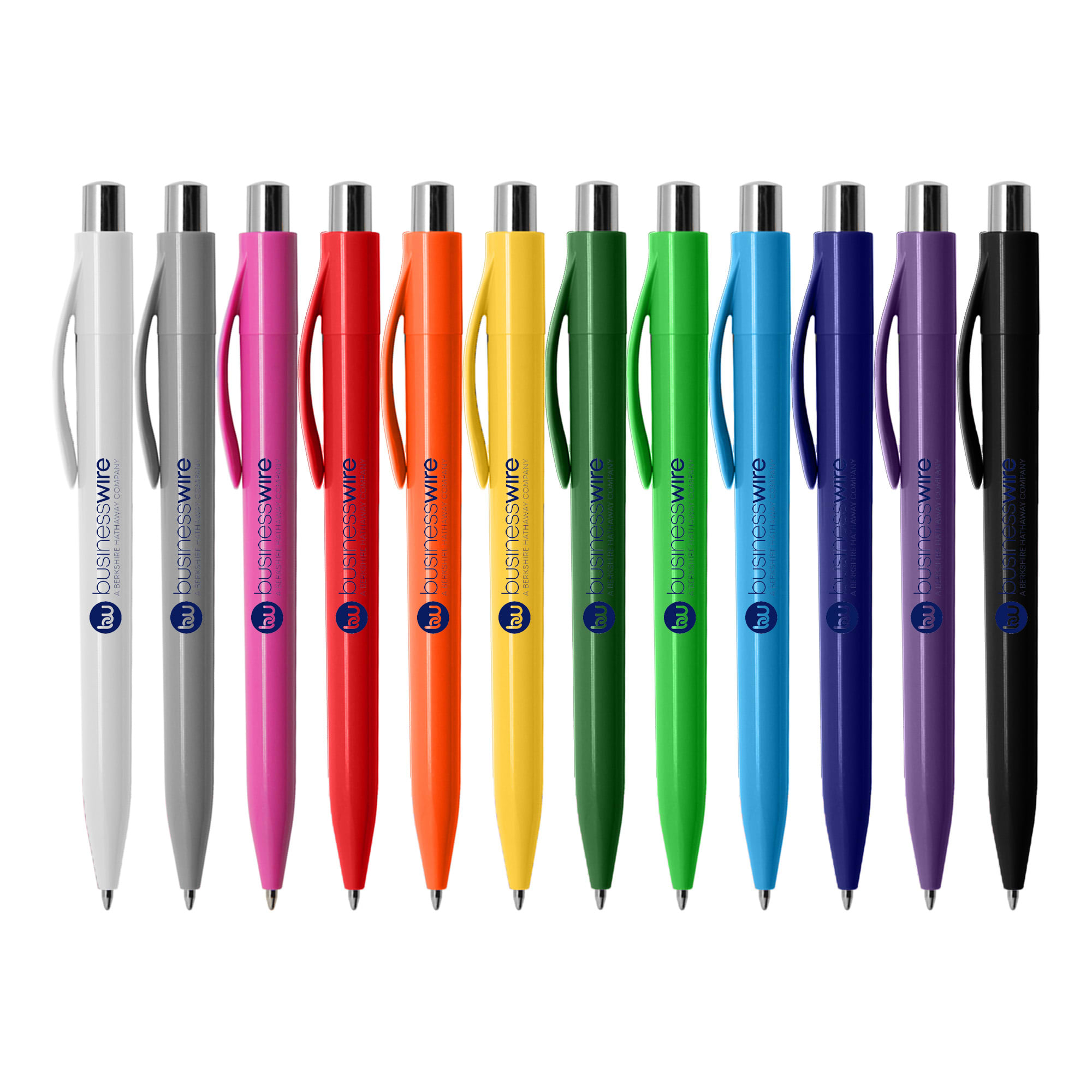 Retractable plastic pen with silver chrome push button simple design with large colour selection. It has high quality German manufactured black ink refill 1800 meters writing distance tungsten carbide ball provides you with quality writing.