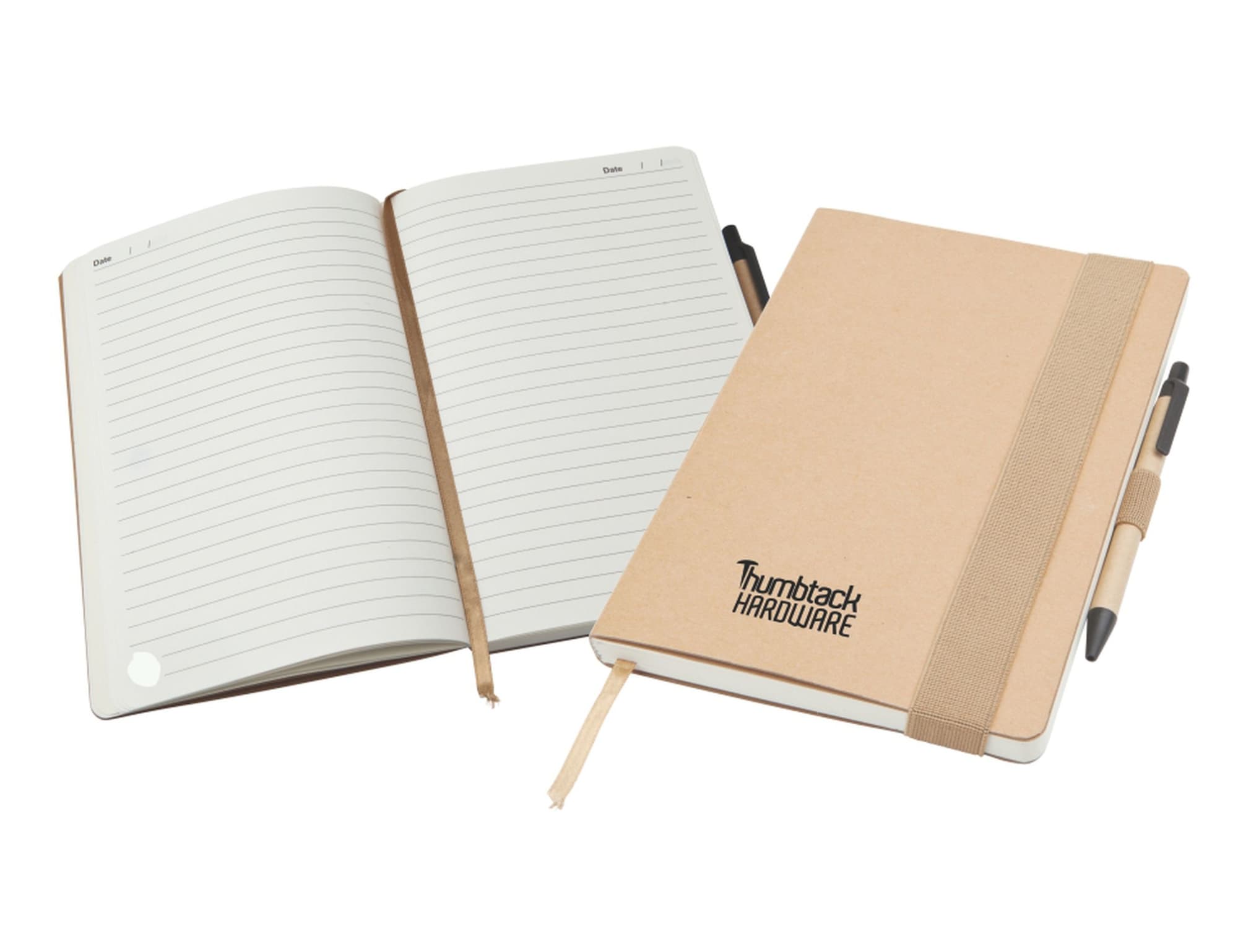 This A5 size note pad is made from recycled paper and is supplied together with a recycled pen. Featuring a natural colour super-wide elastic closure and handy ribbon, perfect as a give-away at meetings and events.