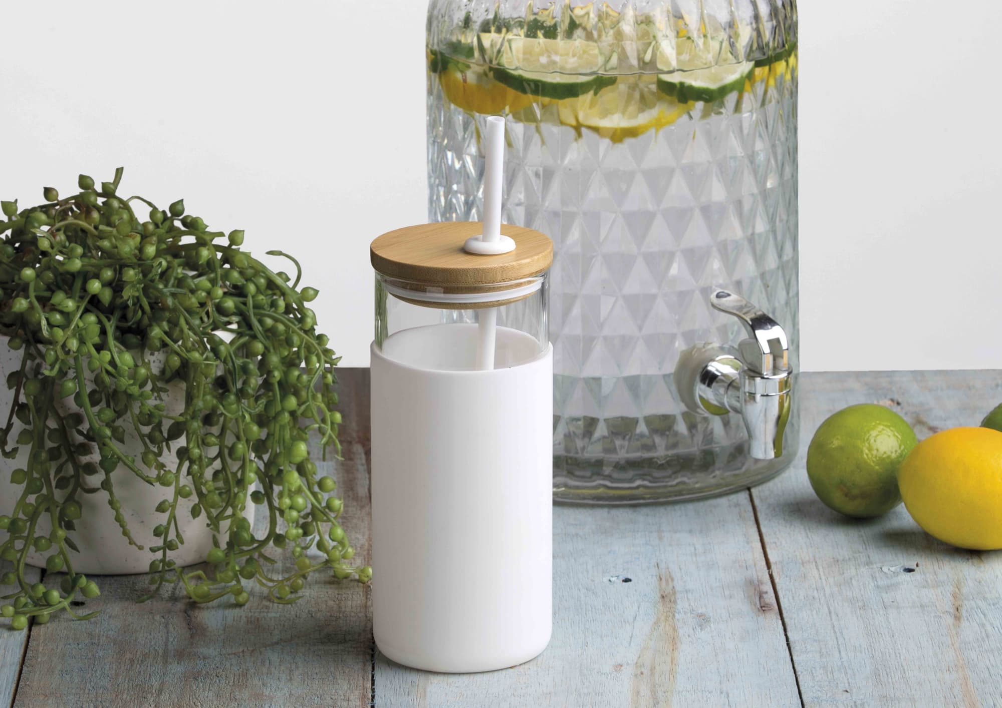 High borosilicate glass bottle|Bespoke natural bamboo push on lid|Easy grip protective coloured silicone sleeve|Colour matching PP straw|BPA Free|Supplied: in a black po ‘di fame presentation tube (25.5cm H x 9cm Dia.)|Capacity: 590ml