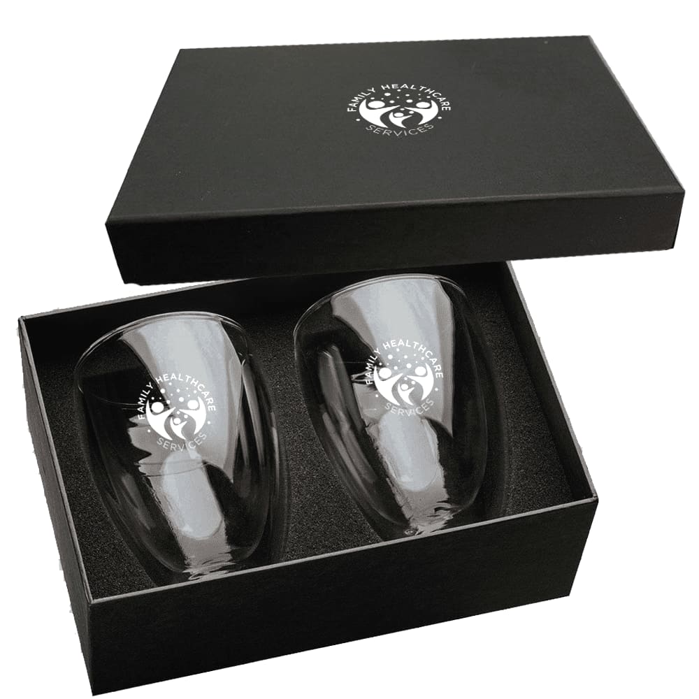 This set of two double-walled coffee and tea glasses have a 300ml capacity and are packed in a black two-part gift box. Hand wash only.