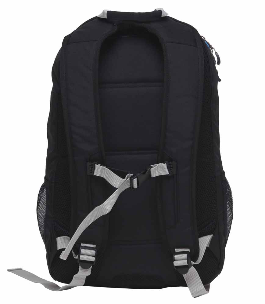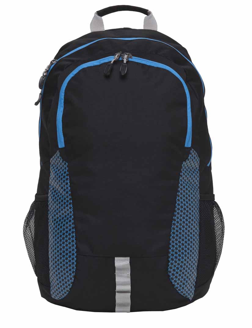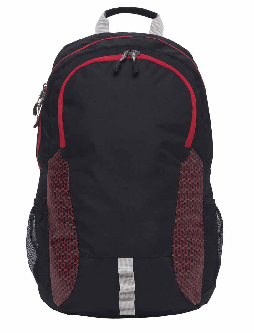 600D polyester with PU backing|Pop Colour honeycomb print panel detail|Fully cell foam padded laptop compartment fits 15” laptop|Tablet cell foam padded compartment fits 11” iPad/tablet|Yoke padded shoulder straps with adjustable sternum straps with quick release buckle and padded Mesh back panels|Rubber feet for protection|Dual mesh drink bottle pockets|Contrast daisy chain gear loops|Quick grab handle|Capacity: 27 Litres