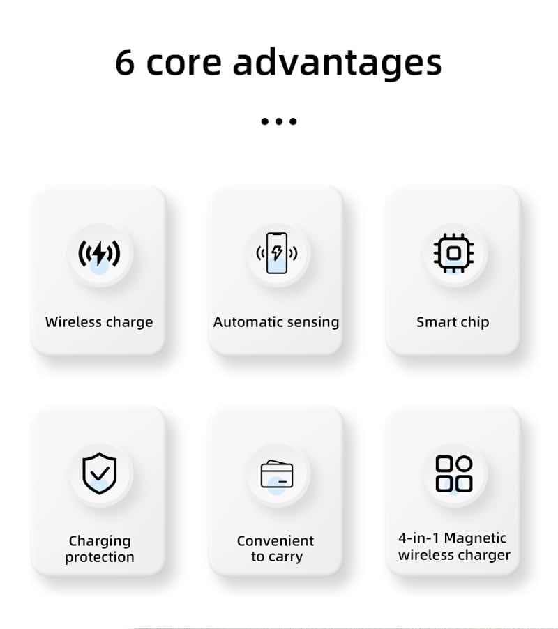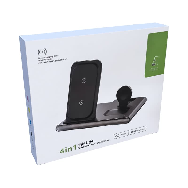 | Specifications | Wireless Charger Type-C Input: DC 9V/3A, Charge Cable: 3 Amp. Phone Wireless Output Power: 5W / 7.5W / 10W/ 15W (Max). TWS Wireless Output Power: 5W (Max), Watch Wireless Output Power: 3W (Max), Charge Coils: 4, Output Efficiency: ≤ 80%, Transmission Range: ≤ 10 mm. Wall Adaptor: 30W (QC3.0). |
