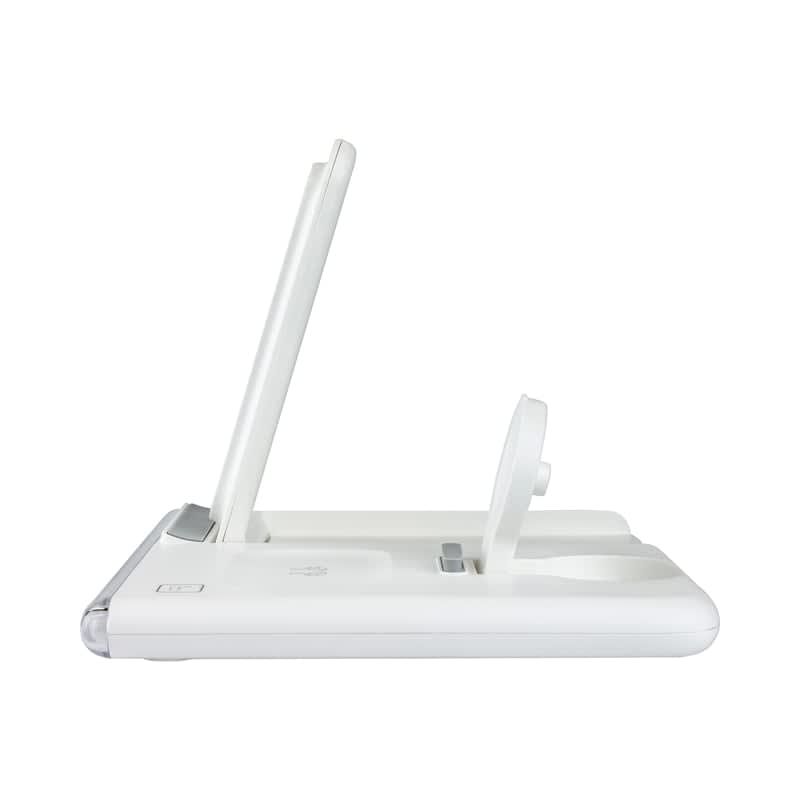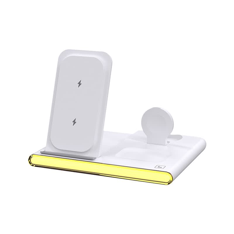 The Haines 15W wireless charging stand is foldable, compact, and convenient on the desk or while travelling. It simultaneously allows for quick and efficient charging of your Qi-compatible phone, TWS earbuds with wireless charging cases, and an iWatch or Samsung Galaxy Watch. The stand supports both portrait and landscape orientations for phone charging and features a switchable LED nightlight. Safety is a top priority with this device, which includes ventilation holes that help reduce heat build-up, foreign object detection, overcurrent protection, and short-circuit prevention. The package includes a Type-C charge cable, a 30W (QC3.0) wall adaptor, and a user manual. Materials: ABS, Acrylic, PC.