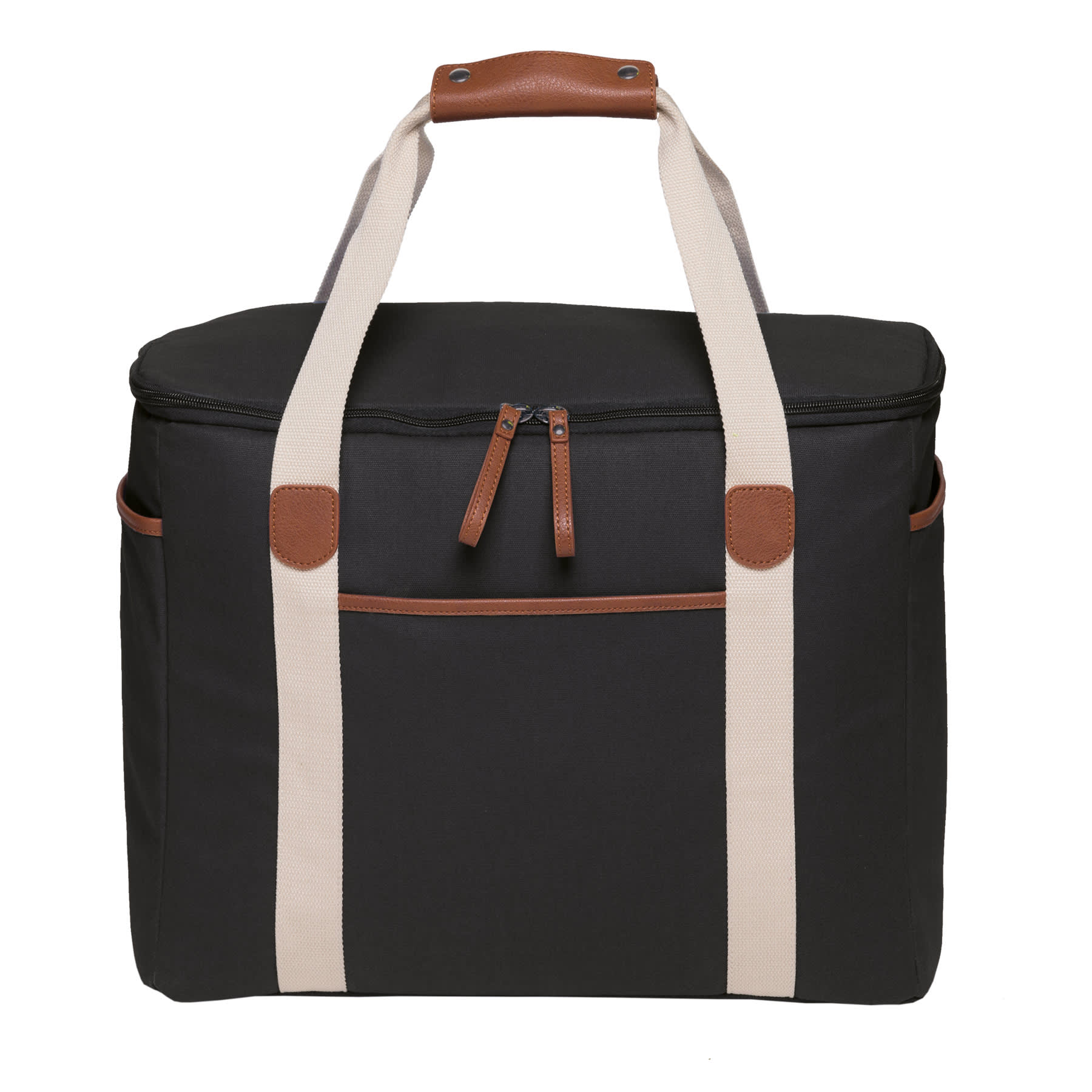 12oz Luxury waxed cotton canvas with faux leather trim|Huge zippered insulated main cooler compartment with heat sealed leak-proof PEVA lining|Front and end slip accessory pockets|Wide contrast webbing carry handles with faux leather wrap and dome closure|Gunmetal zip sliders with faux leather zip pullers|Capacity: 30 Litres