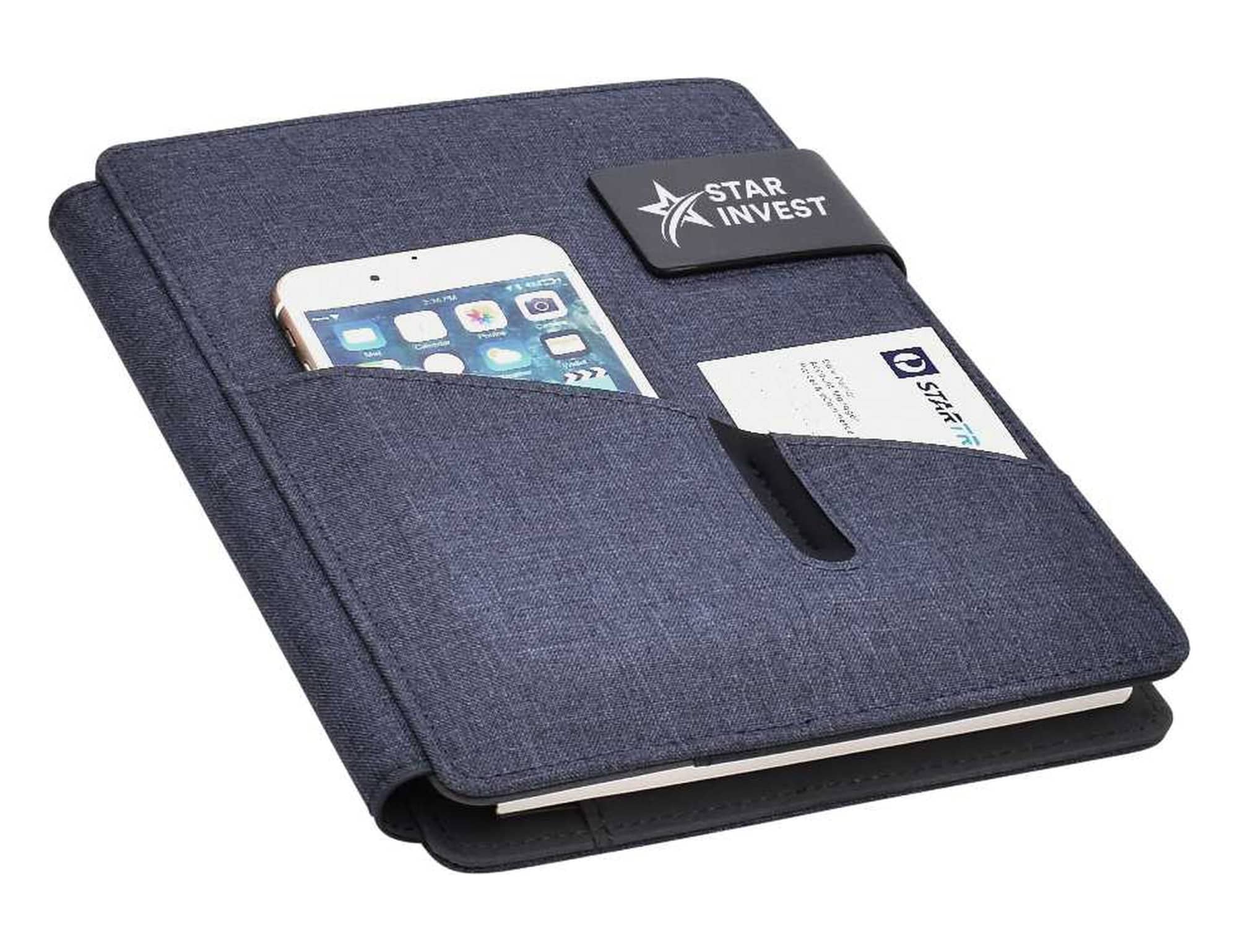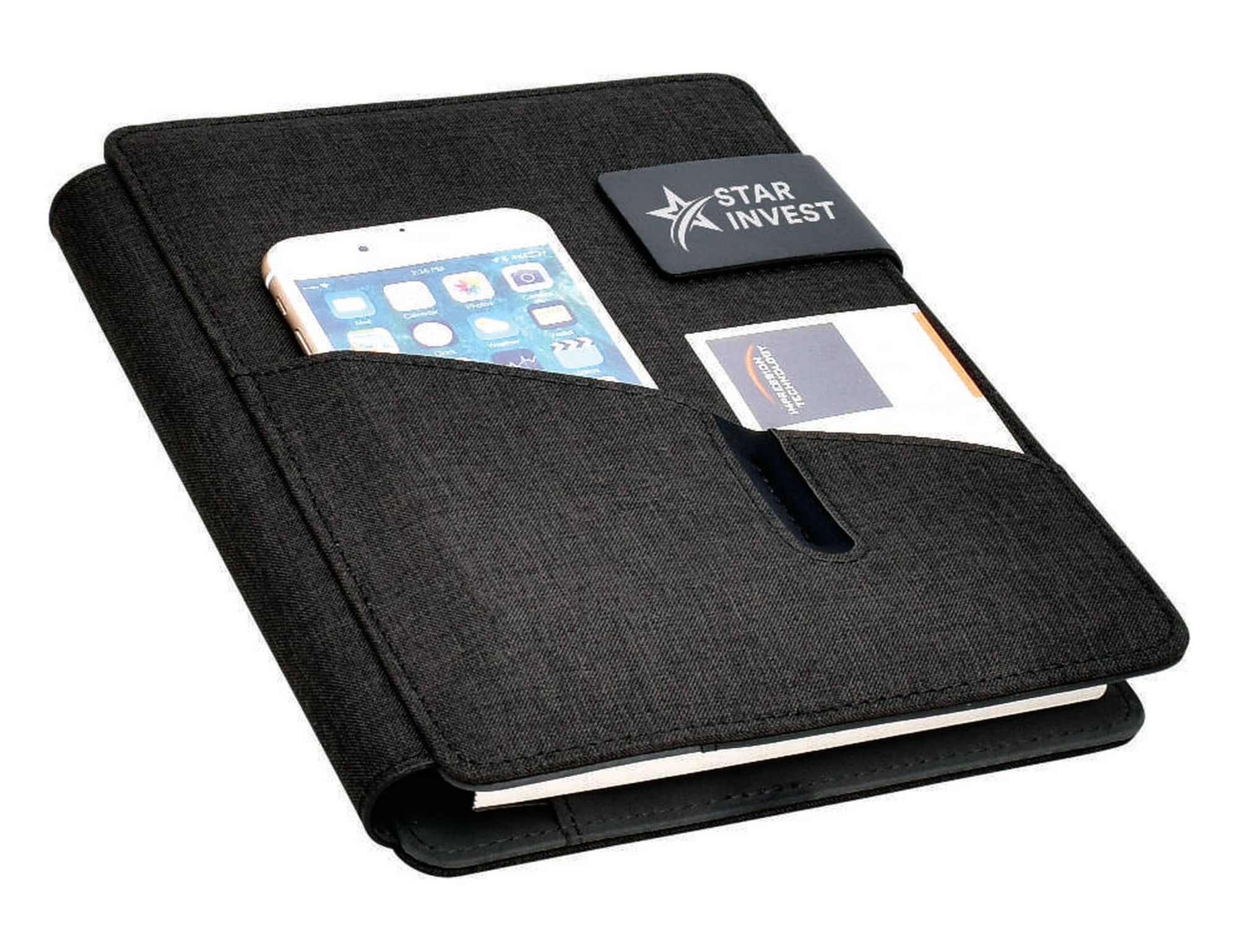 leather-look magnetic closure and is supplied with a ruled, side folding notepad. Available in grey, navy or black. (Accessories not included)