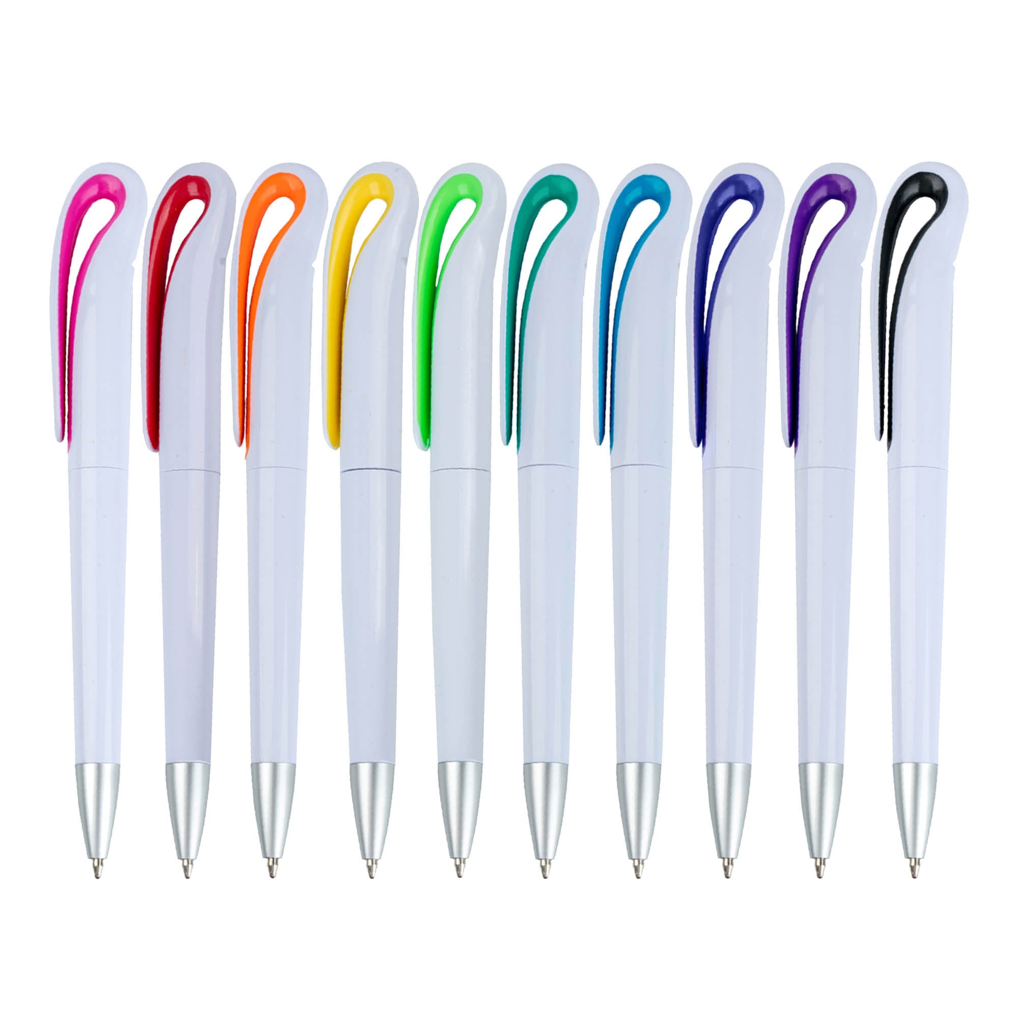 Twist action European style plastic pen white barrel with shiny silver chrome tip an eye catching stylish unique design clip a great promotional pen for your corporate logo or next event. It has high quality German manufactured black ink refill 1800 meters writing distance tungsten carbide ball provides you with quality writing.