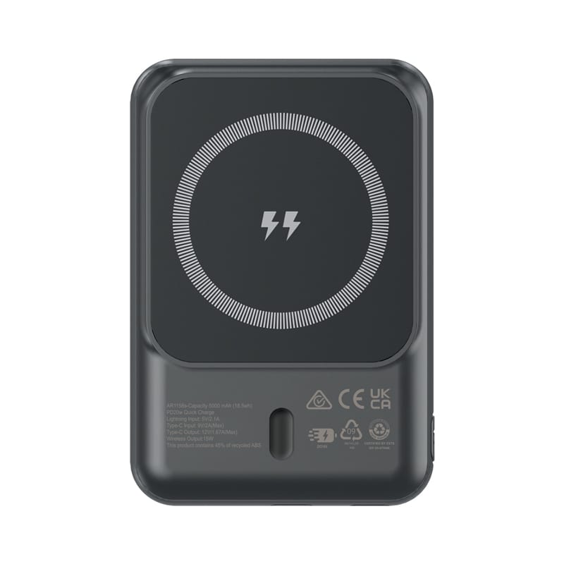 | Specifications | 5000 mAh (18.5 Wh) Lithium-Polymer Battery. Total Output 20W, Quick Charge, Lightning Input: 5V/2.1A, Type-C Input: 5V/3A, 9V/2A, 12V/1.5A, Type-C Output: 5V/3A, 9V/2.22A, 12V/1.66A, Wireless Output: 15W (backward compatible 10W, 7.5W & 5W), Battery Charge Time: 2-3 hours, Number of Device Charges: iPhone 17 Pro (71%), Samsung s27 (64%), Charge Cycle > 500 times. |