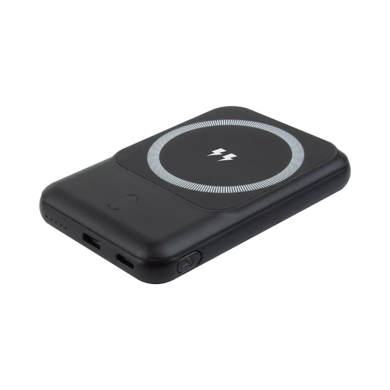 Experience the convenience of MagSafe wireless charging with the Jordan power bank! This compact 5,000 mAh power bank magnetically attaches to iPhone 12 models and above, as well as Android phones with a magnetic ring, enabling fast 15-watt charging. It features dual Lightning and Type-C inputs, a quick-charge Type-C output, and built-in protection circuitry. The power bank is also compatible with any 5-volt device that requires a charging cable. The package includes a Type-C charging cable, a magnetic ring, and a user manual. Crafted from recycled ABS material, the Jordan power bank is an eco-friendly charging solution.