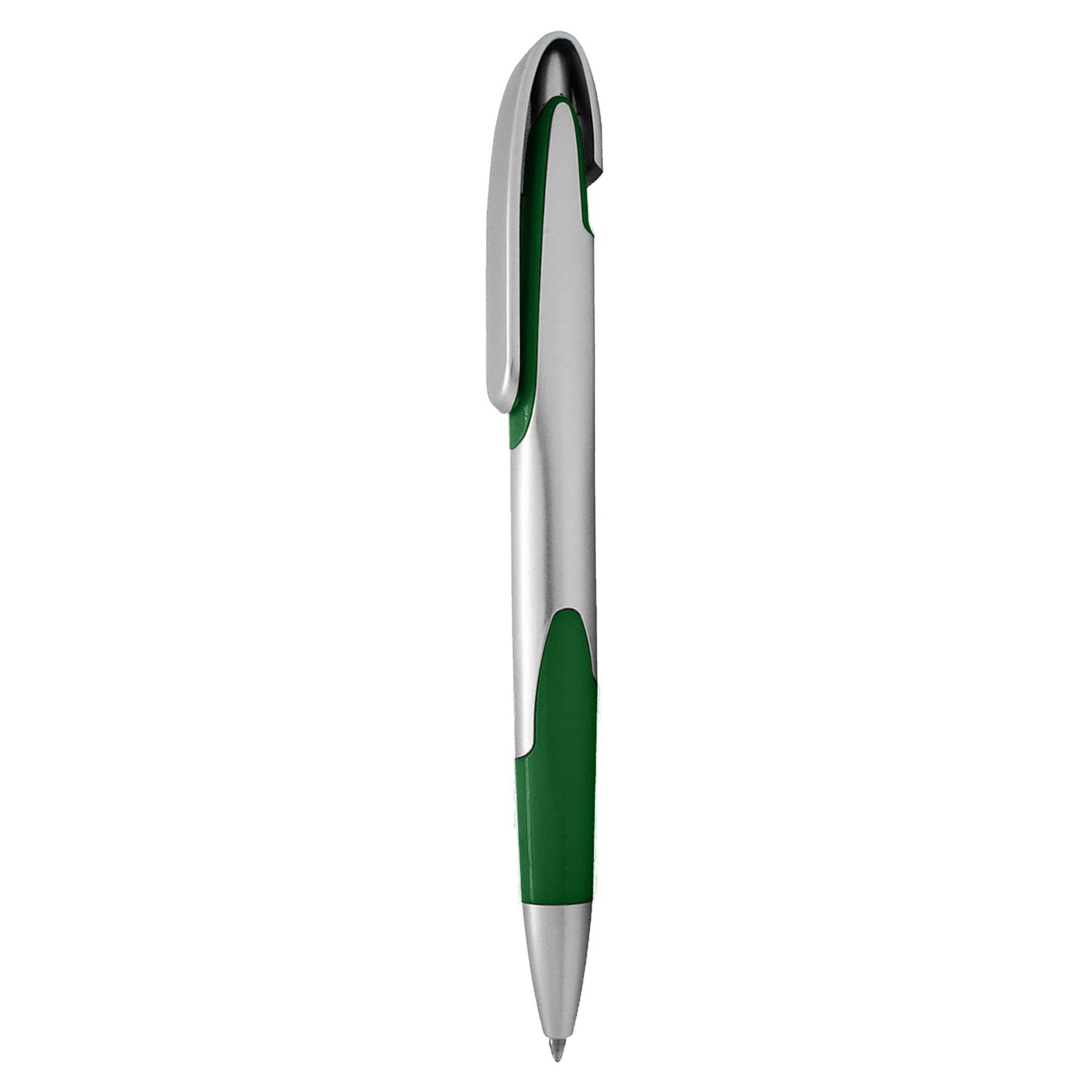 Click action plastic pen with broad printing area on clip silver opaque barrel and clip with coloured soft-touch grip a small coloured panel beneath the clip matches the grip colour matt silver chrome tip. It has high quality German manufactured black ink refill 1800 meters writing distance tungsten carbide ball provides you with quality writing.