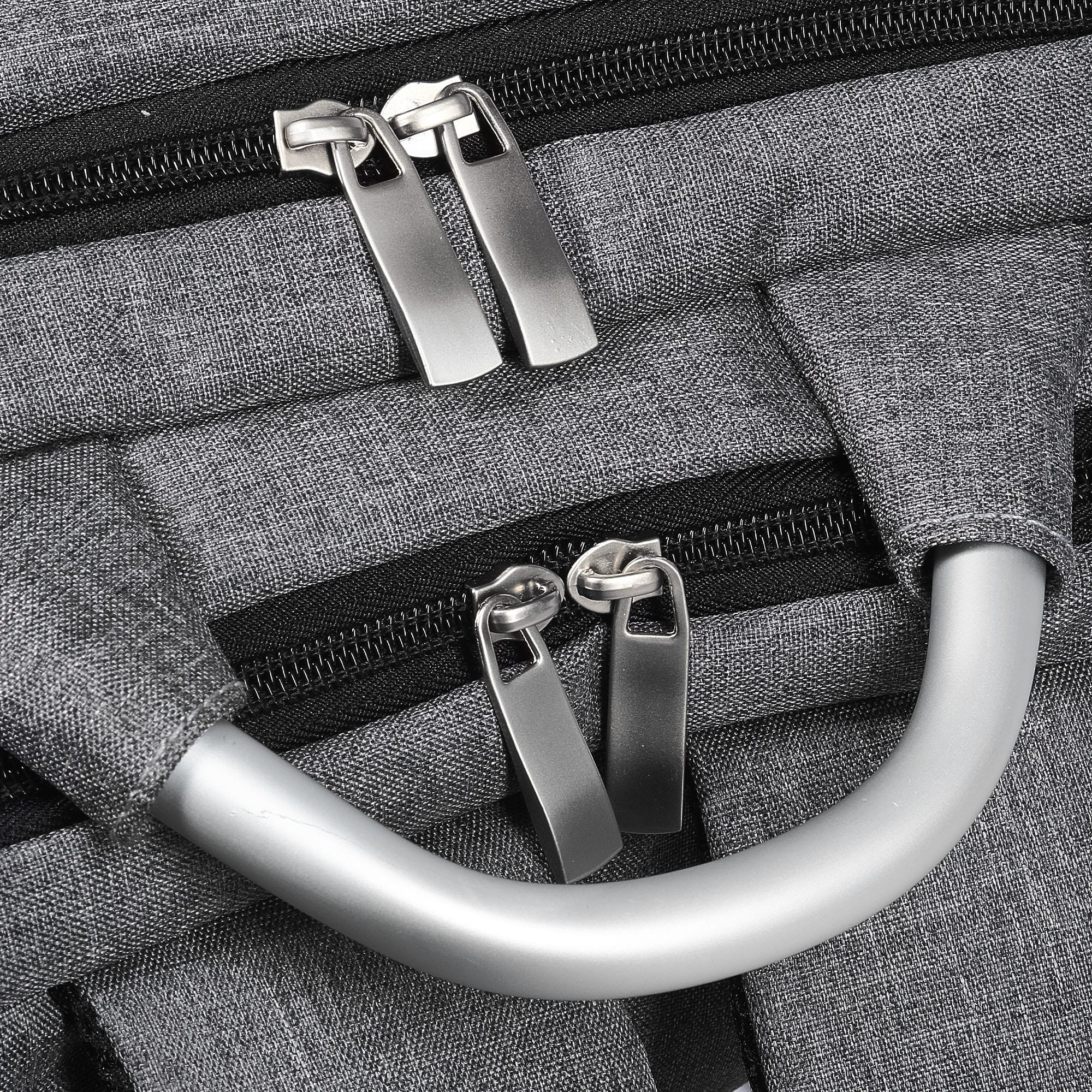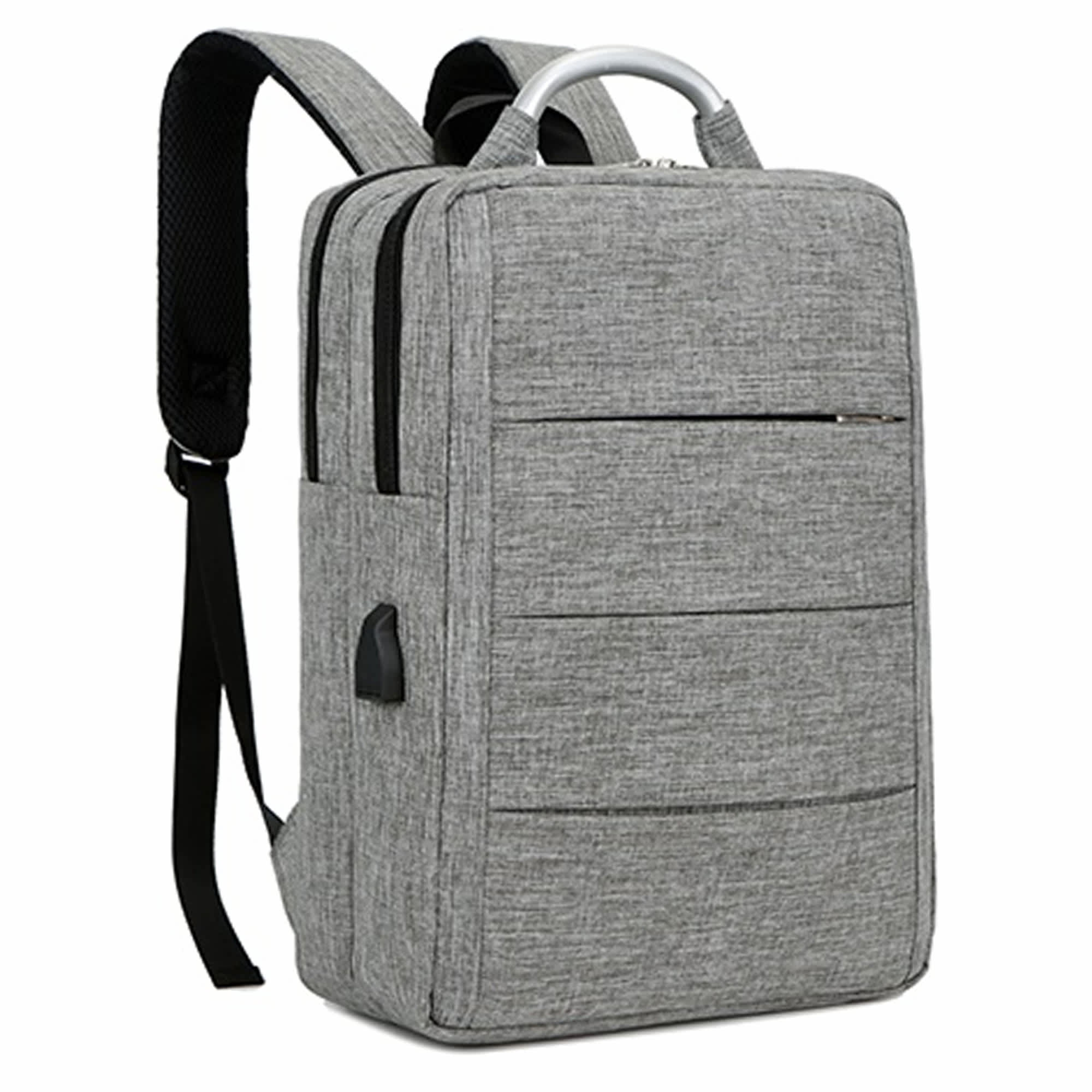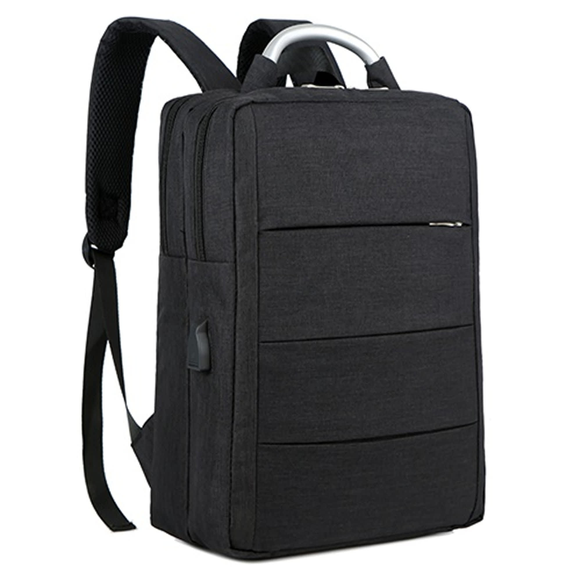 This modern stylish laptop backpack is made from high quality sponge nylon and has one front zipped pouch. The bag is combined with 2 complete independent front and back compartments front compartment has 2 small pouches and a pen holder the back compartment has a large pouch with black velcro closure strap for laptop and iPad this pouch is padded thicker to protect inside laptop and iPad. It also features USB charging port with a charging cord attached (inside power bank not included) and adjustable straps. Bag has a zip closure top for both compartments an aluminium handle in the middle is for you to carry the bag by hand.