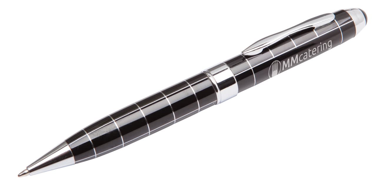 A traditional shaped pen with unique silver contrast lines. Available in black with chrome trim.