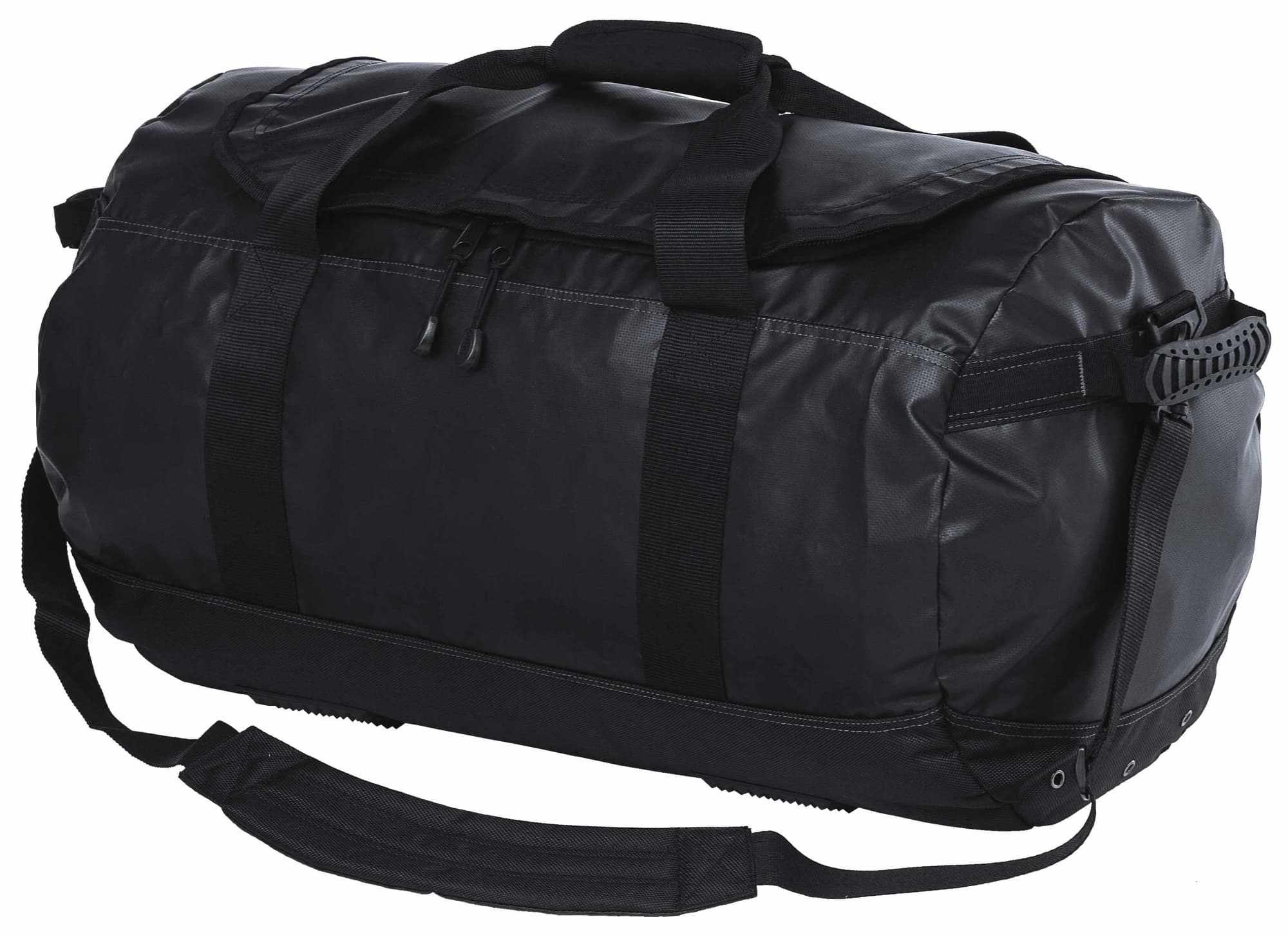 500D water resistant polyester tarpaulin with PVC coating and 1680D ballistic polyester base|Huge main compartment with extra wide U-shaped zippered opening|Main compartment includes one large zippered mesh accessory pocket and two PE fabric internal wet area compartments with ventilation eyelets|Moulded rubber reinforced quick grab handle on both ends|Oversized panel webbing for extra strength and durability|Contrast top stitch detailing|Neoprene Velcro wrap carry handle|Rubber feet for added protection|Detachable/adjustable padded shoulder strap|Heavy duty oversized zippers and accessories|ID card window pocket|Capacity: 77 Litres