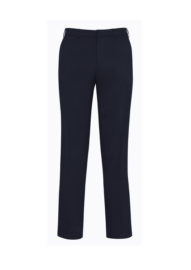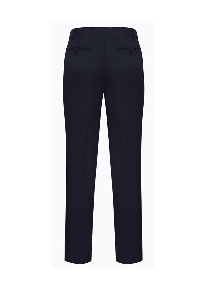 Features: Flat front and tapered through the leg. Waistband with stretch fusing. Internal security pocket on right front pocket, and two rear pockets.