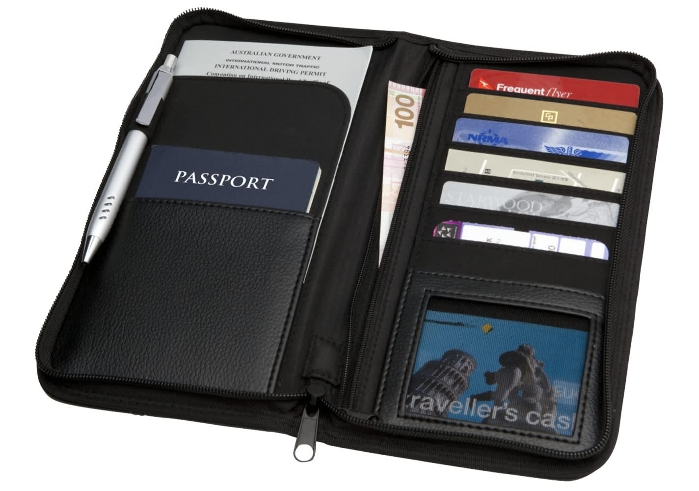 This soft grain finish zippered travel wallet makes the ideal travel companion. Features include a passport pocket, multiple card pockets, ticket flap, security compartment with zip and pen loop. Your logo can be printed onto the wallet or engraved on the brushed chrome accent plate. Pen additional.
