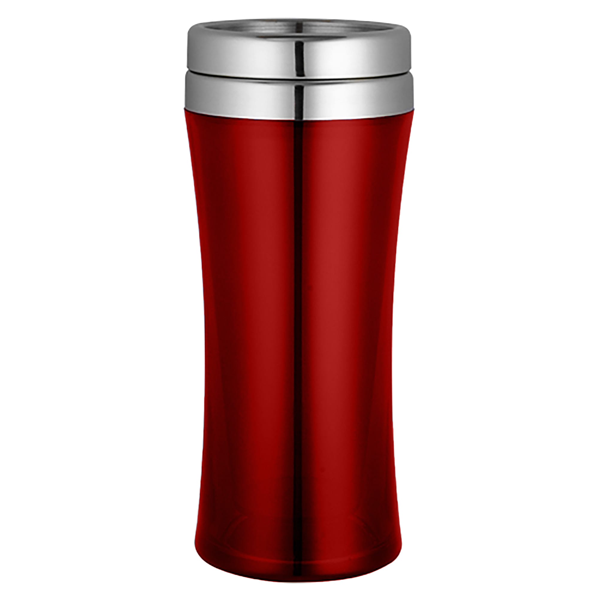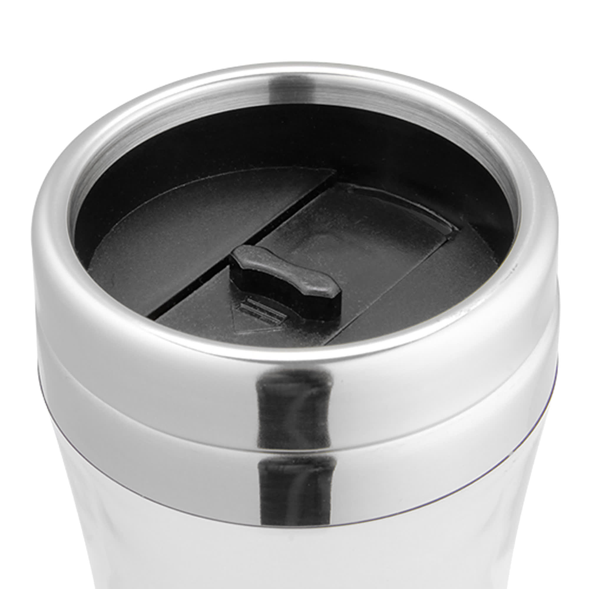 400ml double wall plastic travel mug made of food grade transparent plastic and BPA free a stainless steel capped plastic lid with splashproof push-seal closure this product is not dishwasher safe and handwashing is recommended.