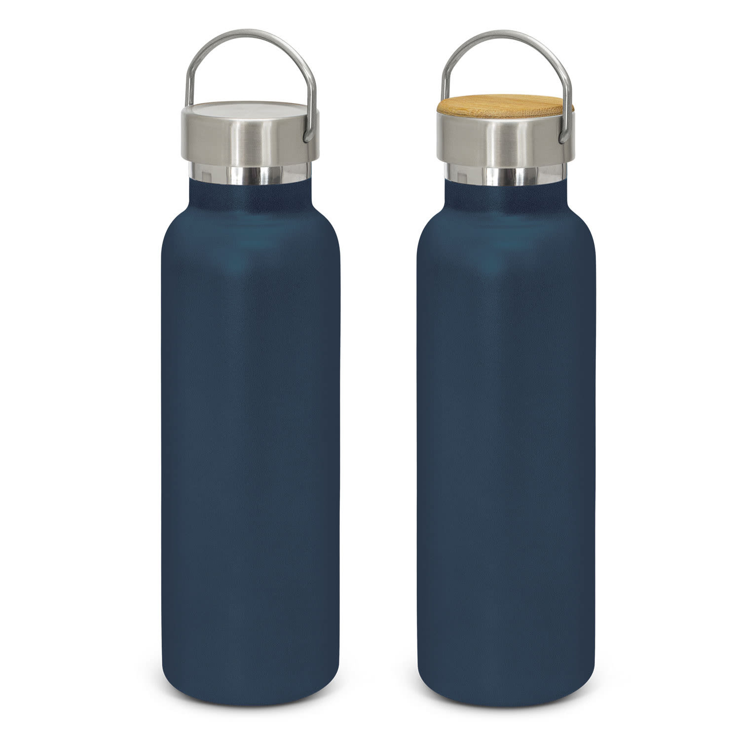 Impressive 650ml BPA-free, double wall, vacuum insulated stainless steel drink bottle which has an extremely durable powder coated matte finish. It will keep drinks cold for 24 hours or hot for up to 12 hours. It has a trendy screw on lid with a stainless steel carry handle that offers a prominent branding opportunity and is available in full stainless steel or with a bamboo veneer. Bamboo is a natural material which produces unavoidable variances in the grain pattern, colour and branding. The lid laser engraves to a natural etch and the bottle laser engraves to a shiny steel finish. It is nicely presented in a black gift box or an