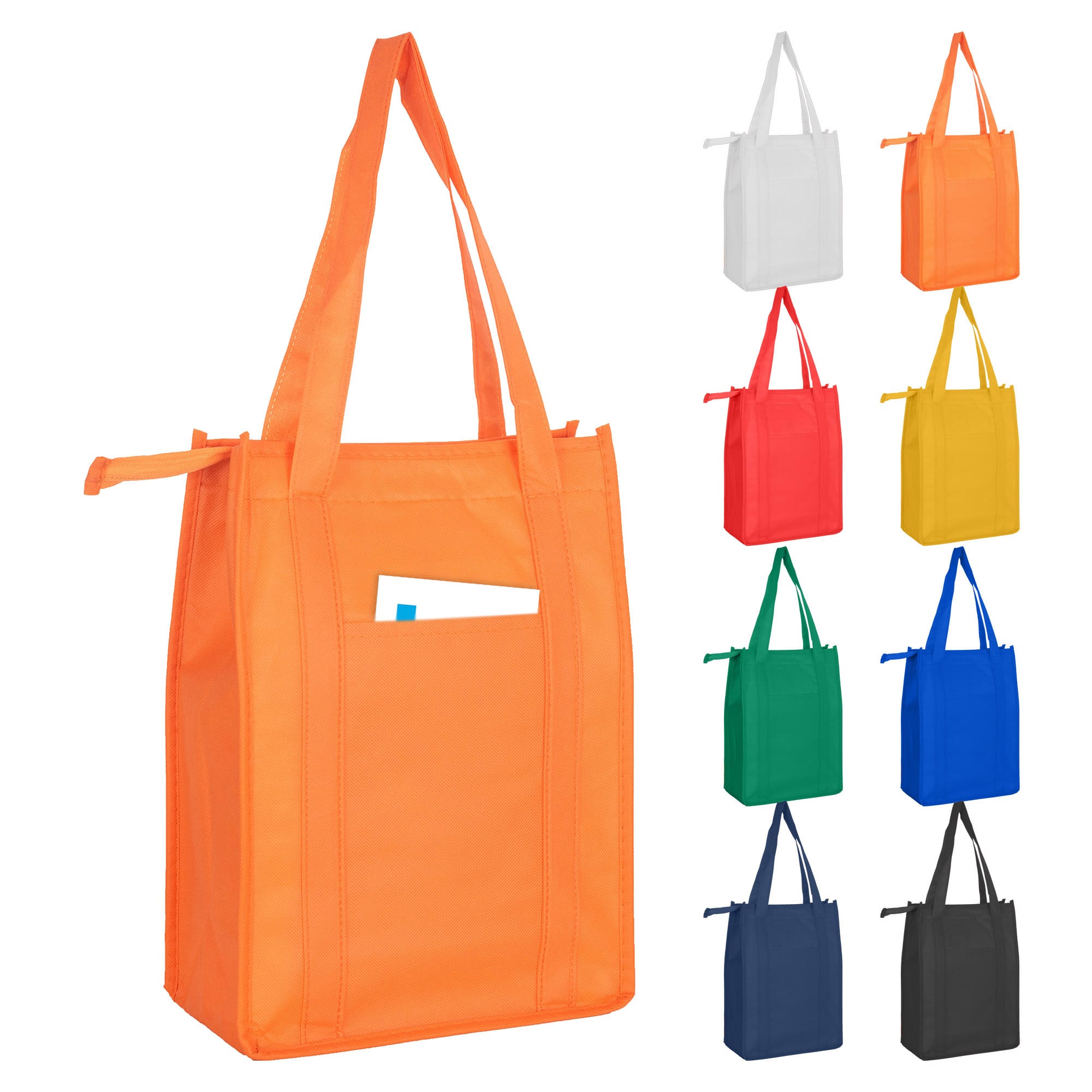 Aluminium foil PE foam thermal insulated non woven cooler bag with zipped top closure front slip pocket and reinforced handles. It is made of 90gsm new polypropylene material which is more durable and stronger. Capacity 10L.